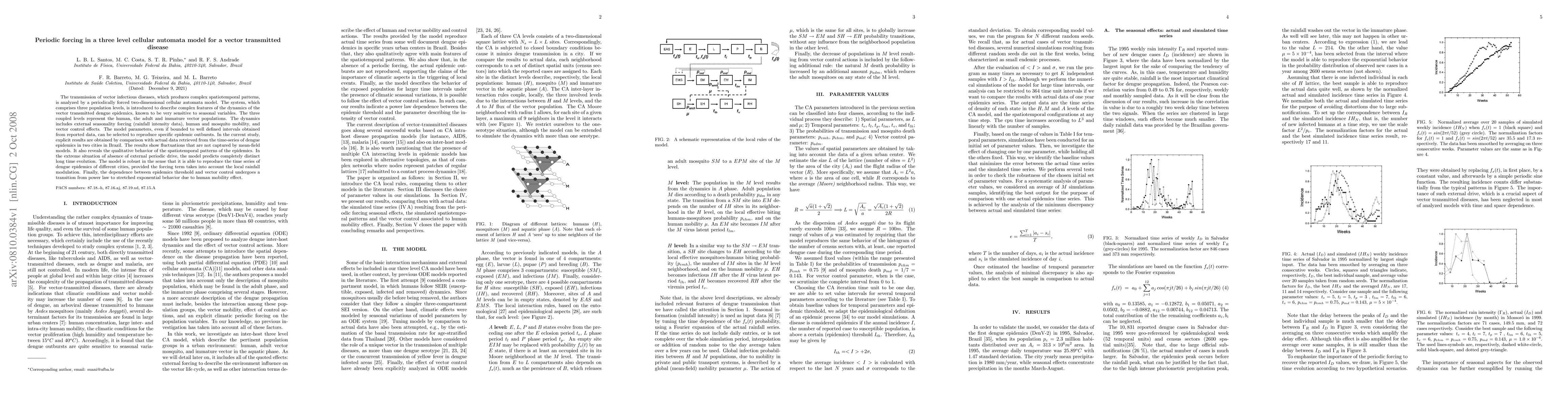 The transmission of vector infectious diseases, which produces complex spatiotemporal patterns, is analyzed by a periodically forced two-dimensional cellular automata model. The system, which comprises three population levels, is introduced to describe complex features of the dynamics of the vector transmitted dengue epidemics, known to be very sensitive to seasonal variables. The three coupled levels represent the human, the adult and immature vector populations. The dynamics includes external seasonality forcing (rainfall intensity data), human and mosquito mobility, and vector control effects. The model parameters, even if bounded to well defined intervals obtained from reported data, can be selected to reproduce specific epidemic outbursts. In the current study, explicit results are obtained by comparison with actual data retrieved from the time-series of dengue epidemics in two cities in Brazil. The results show fluctuations that are not captured by mean-field models. It also reveals the qualitative behavior of the spatiotemporal patterns of the epidemics. In the extreme situation of absence of external periodic drive, the model predicts completely distinct long time evolution. The model is robust in the sense that it is able to reproduce the time series of dengue epidemics of different cities, provided the forcing term takes into account the local rainfall modulation. Finally, the dependence between epidemics threshold and vector control undergoes a transition from power law to stretched exponential behavior due to human mobility effect.