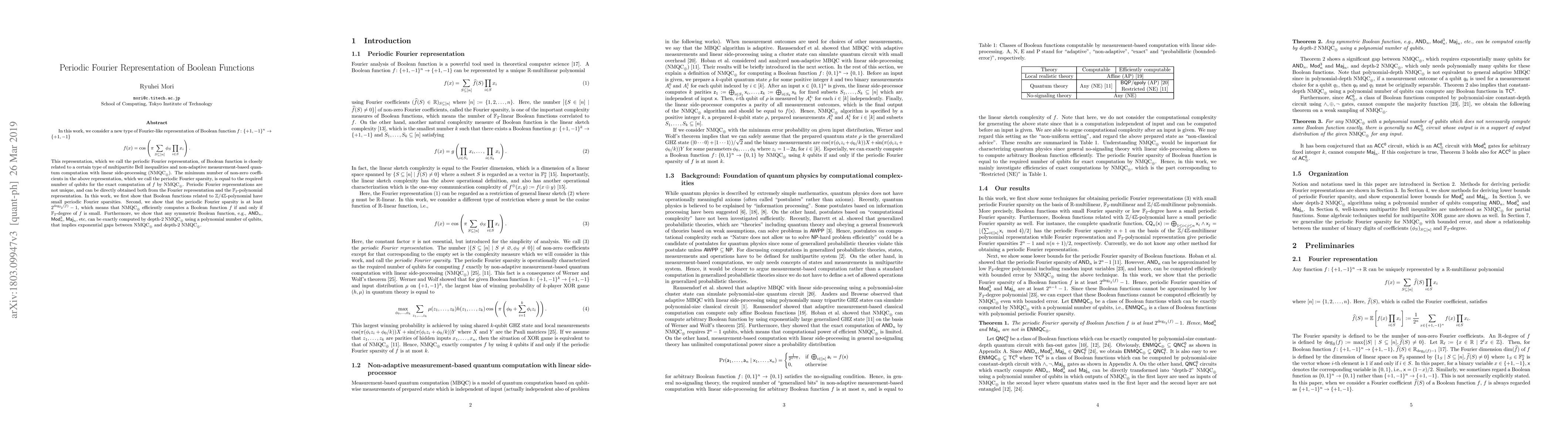 This paper introduces a periodic Fourier representation of Boolean functions, showing its connection to multipartite Bell inequalities and non-adaptive measurement-based quantum computation. It demonstrates that Boolean functions related to $\mathbb{Z}/4\mathbb{Z}$-polynomials have small periodic Fourier sparsity, and establishes a lower bound for the sparsity, indicating efficient computation by quantum methods when the Boolean function's degree is small.