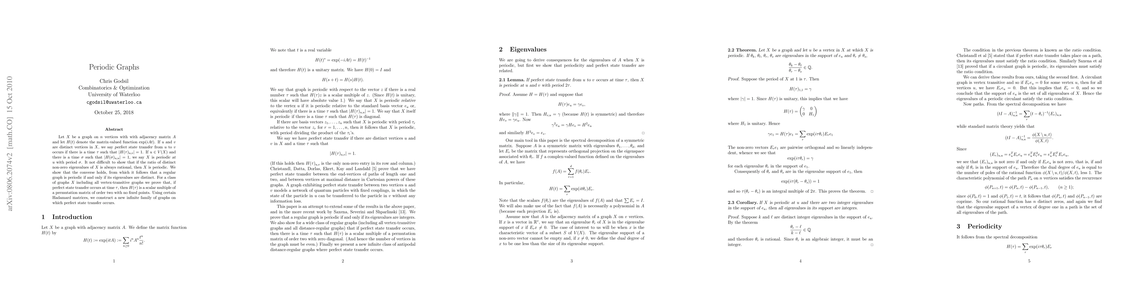 A graph is periodic at a vertex if perfect state transfer occurs from that vertex to itself; the paper shows this is equivalent to having integer eigenvalues for some regular graphs. Perfect state transfer also implies specific properties of the adjacency matrix.