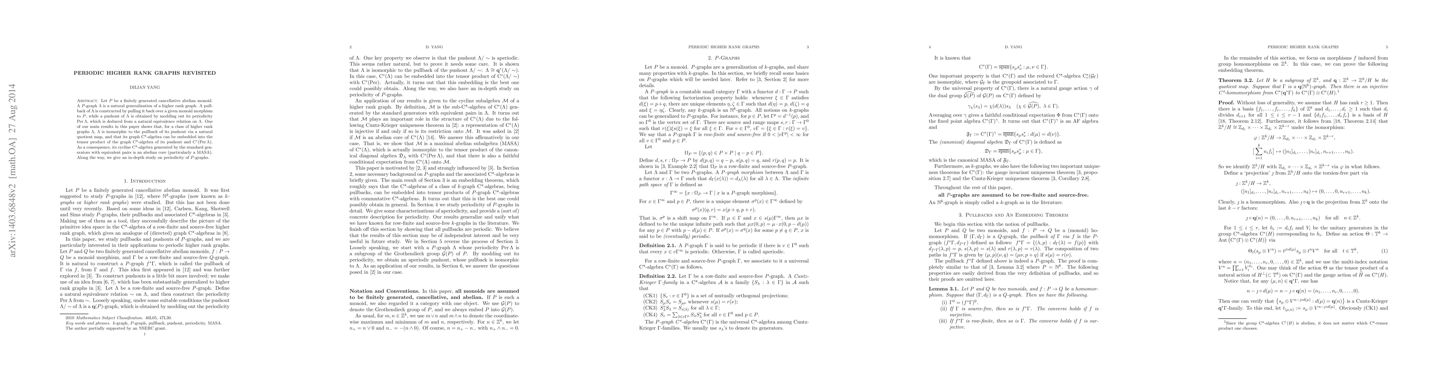 Let $P$ be a finitely generated cancellative abelian monoid. A $P$-graph $\Lambda$ is a natural generalization of a higher rank graph. A pullback of $\Lambda$ is constructed by pulling it back over a given monoid morphism to $P$, while a pushout of $\Lambda$ is obtained by modding out its periodicity $\Per\Lambda$, which is deduced from a natural equivalence relation on $\Lambda$. One of our main results in this paper shows that, for a class of higher rank graphs $\Lambda$, $\Lambda$ is isomorphic to the pullback of its pushout via a natural quotient map, and that its graph C*-algebra can be embedded into the tensor product of the graph C*-algebra of its pushout and $\ca(\Per\Lambda)$. As a consequence, its cycline C*-algebra generated by the standard generators with equivalent pairs is an abelian core (particularly a MASA). Along the way, we give an in-depth study on periodicity of $P$-graphs.