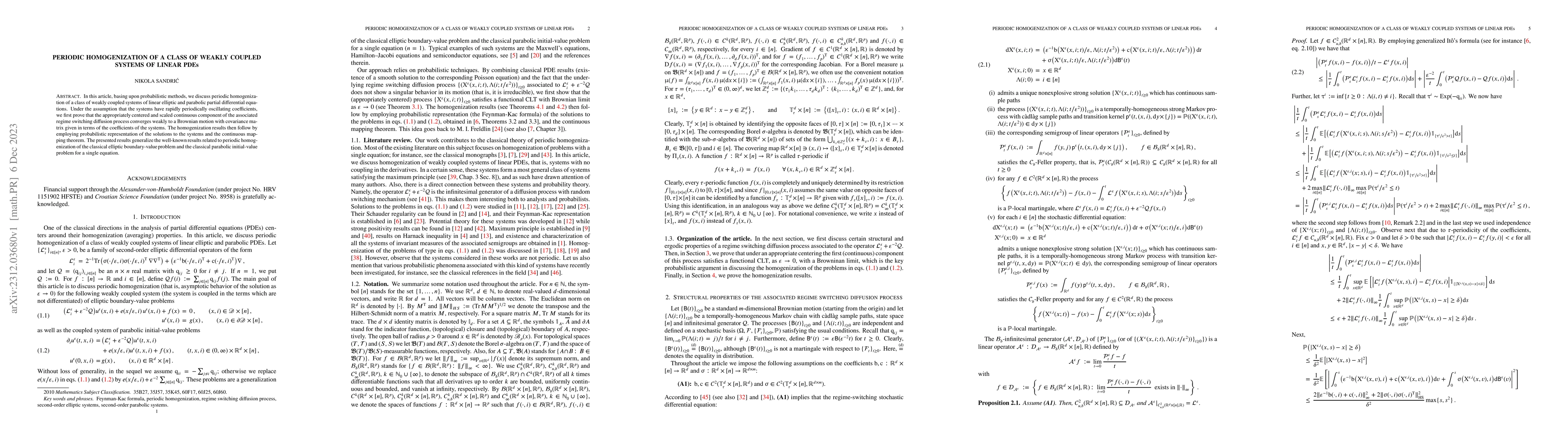 This paper uses probabilistic methods to study the periodic homogenization of weakly coupled systems of linear elliptic and parabolic PDEs with rapidly oscillating coefficients. It demonstrates the convergence of the associated regime switching diffusion process to Brownian motion, leading to homogenization results via probabilistic representations and the continuous mapping theorem.