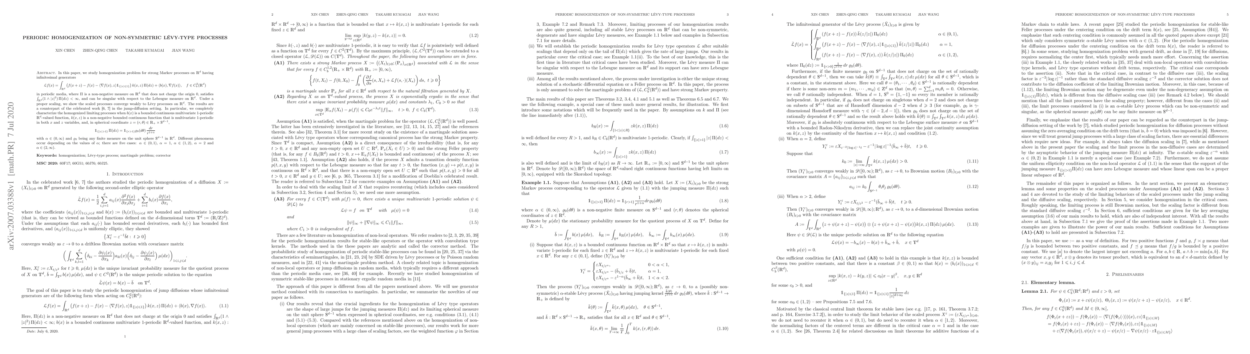 This paper investigates the periodic homogenization of non-symmetric Lévy-type processes in periodic media, showing that under proper scaling, the processes converge weakly to Lévy processes. It characterizes the limiting processes under various conditions on the jump measure, revealing distinct phenomena based on the value of the exponent $\alpha$.