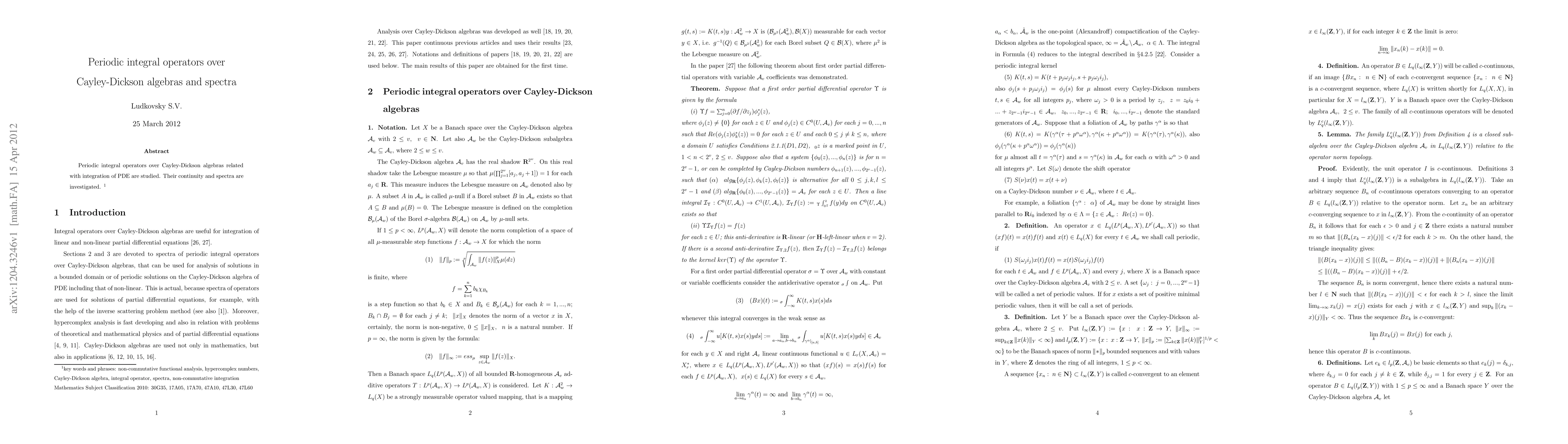 Periodic integral operators over Cayley-Dickson algebras related with integration of PDE are studied. Their continuity and spectra are investigated.