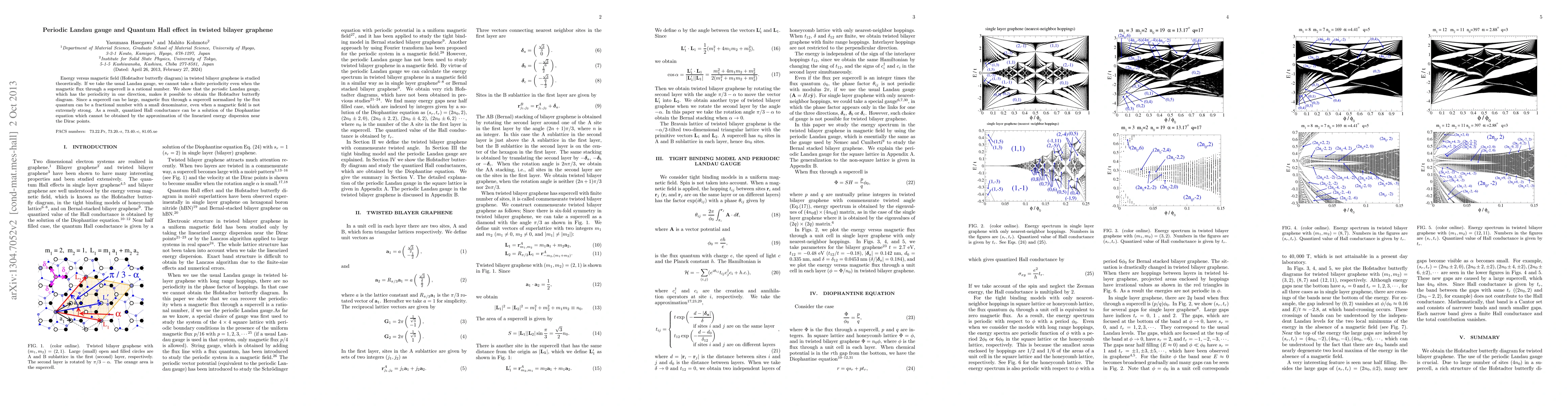 Energy versus magnetic field (Hofstadter butterfly diagram) in twisted bilayer graphene is studied theoretically. If we take the usual Landau gauge, we cannot take a finite periodicity even when the magnetic flux through a supercell is a rational number. We show that the \textit{periodic} Landau gauge, which has the periodicity in one direction, makes it possible to obtain the Hofstadter butterfly diagram. Since a supercell can be large, magnetic flux through a supercell normalized by the flux quantum can be a fractional number with a small denominator, even when a magnetic field is not extremely strong. As a result, quantized Hall conductance can be a solution of nontrivial Diophantine equation.