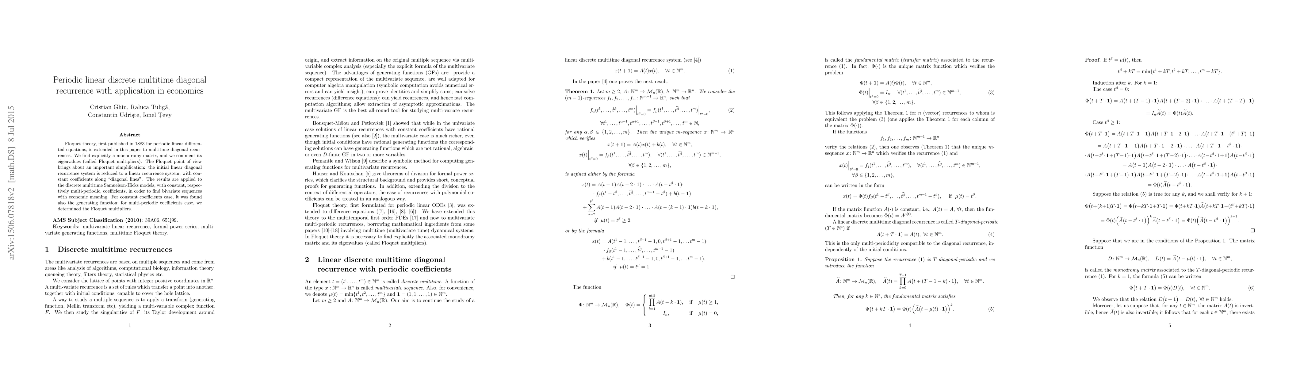 Floquet theory, first published in 1883 for periodic linear differential equations, is extended in this paper to multitime diagonal recurrences. We find explicitly a monodromy matrix, and we comment its eigenvalues (called Floquet multipliers). The Floquet point of view brings about an important simplification: the initial linear diagonal recurrence system is reduced to a linear recurrence system, with constant coefficients along "diagonal lines". The results are applied to the discrete multitime Samuelson-Hicks models, with constant, respectively multi-periodic, coefficients, in order to find bivariate sequences with economic meaning. For constant coefficients case, it was found also the generating function; for multi-periodic coefficients case, we determined the Floquet multipliers.