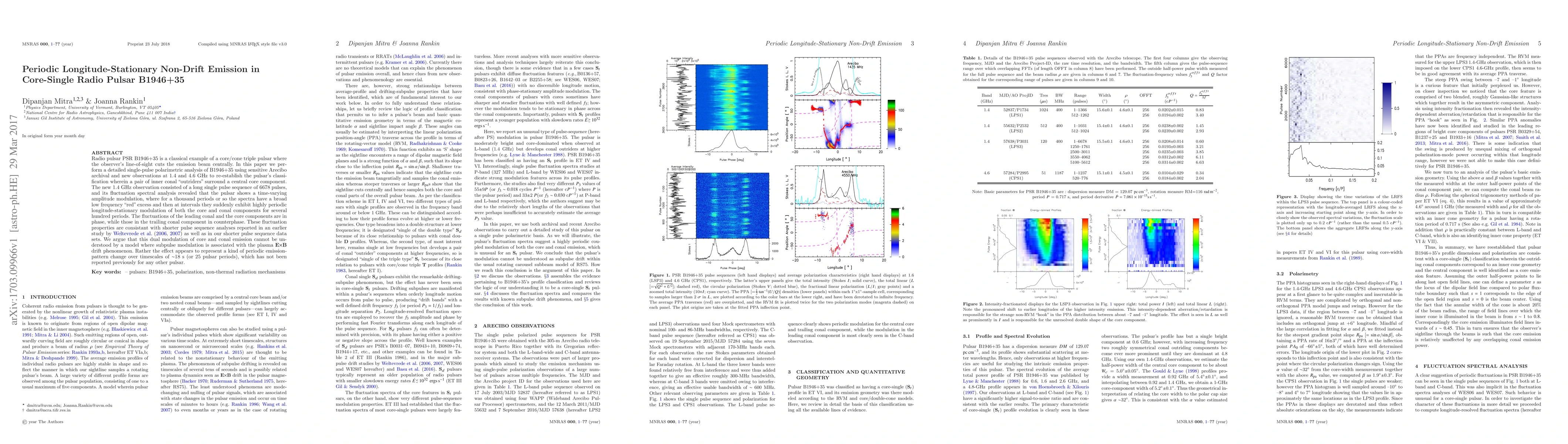 Radio pulsar PSR B1946+35 is a classical example of a core/cone triple pulsar where the observer's line-of-sight cuts the emission beam centrally. In this paper we perform a detailed single-pulse polarimetric analysis of B1946+35 using sensitive Arecibo archival and new observations at 1.4 and 4.6 GHz to re-establish the pulsar's classification wherein a pair of inner conal "outriders" surround a central core component. The new 1.4 GHz observation consisted of a long single pulse sequence of 6678 pulses, and its fluctuation spectral analysis revealed that the pulsar shows a time-varying amplitude modulation, where for a thousand periods or so the spectra have a broad low frequency "red" excess and then at intervals they suddenly exhibit highly periodic longitude-stationary modulation of both the core and conal components for several hundred periods. The fluctuations of the leading conal and the core components are in phase, while those in the trailing conal component in counterphase. These fluctuation properties are consistant with shorter pulse sequence analyses reported in an earlier study by Weltevrede et al. (2006, 2007) as well as in our shorter pulse sequence data sets. We argue that this dual modulation of core and conal emission cannot be understood by a model where subpulse modulation is associated with the plasma {\bf E}$\times${\bf B} drift phenomenon. Rather the effect appears to represent a kind of periodic emission-pattern change over timescales of $\sim$18 s (or 25 pulsar periods), which has not been reported previously for any other pulsar.