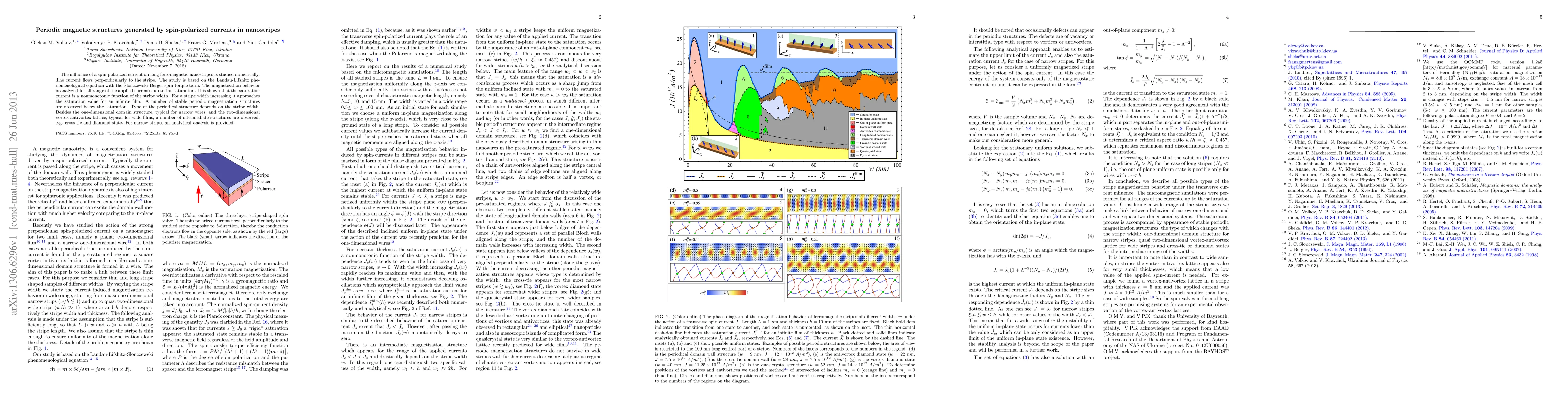 This paper numerically investigates the effects of spin-polarized currents on long ferromagnetic nanostripes, revealing a variety of stable periodic magnetization structures dependent on stripe width, including intermediate states like cross-tie and diamond states, alongside analytical analysis for narrow stripes. The saturation current is shown to be a nonmonotonic function of stripe width.