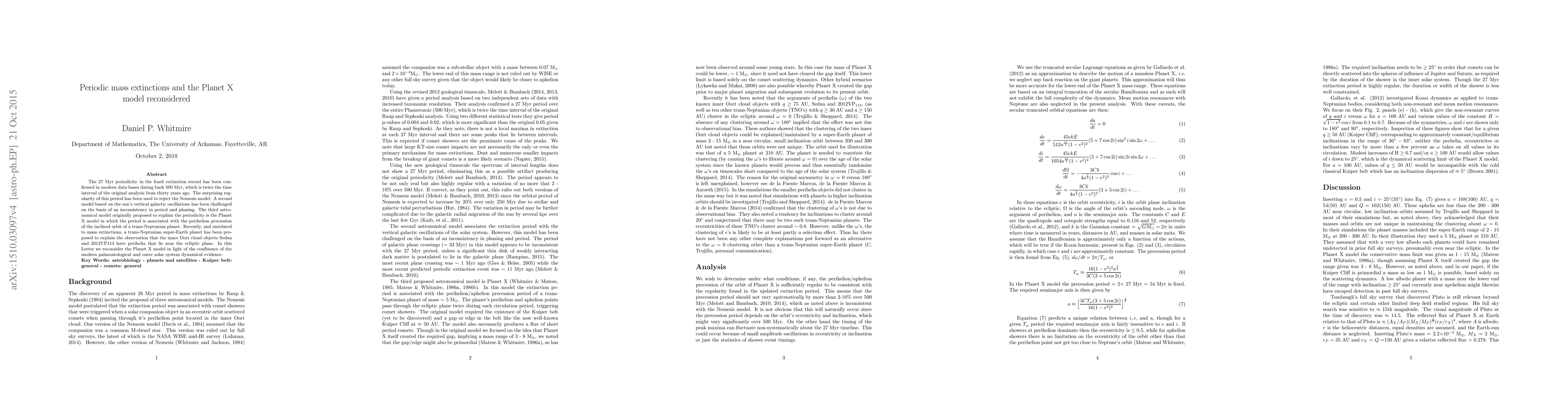 The 27 Myr periodicity in the fossil extinction record has been confirmed in modern data bases dating back 500 Myr, which is twice the time interval of the original analysis from thirty years ago. The surprising regularity of this period has been used to reject the Nemesis model. A second model based on the sun's vertical galactic oscillations has been challenged on the basis of an inconsistency in period and phasing. The third astronomical model originally proposed to explain the periodicity is the Planet X model in which the period is associated with the perihelion precession of the inclined orbit of a trans-Neptunian planet. Recently, and unrelated to mass extinctions, a trans-Neptunian super-Earth planet has been proposed to explain the observation that the inner Oort cloud objects Sedna and 2012VP113 have perihelia that lie near the ecliptic plane. In this Letter we reconsider the Planet X model in light of the confluence of the modern palaeontological and outer solar system dynamical evidence.