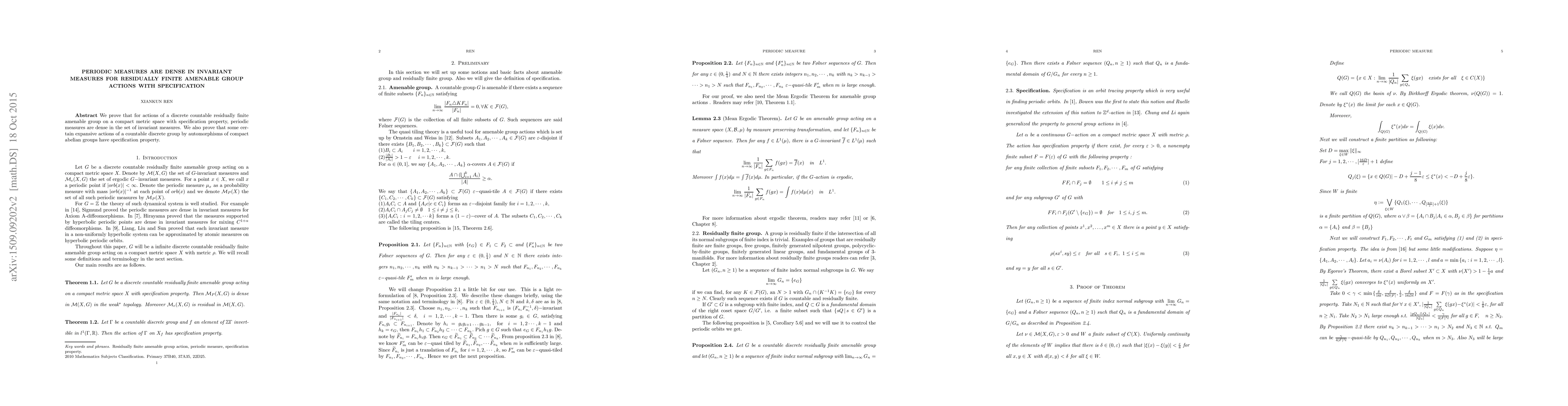 Summary: The paper demonstrates that periodic measures are dense in the set of invariant measures for specific actions of residually finite amenable groups on compact metric spaces possessing a specification property. This result highlights the intricate relationship between periodic dynamics and overall invariant measures in such systems.