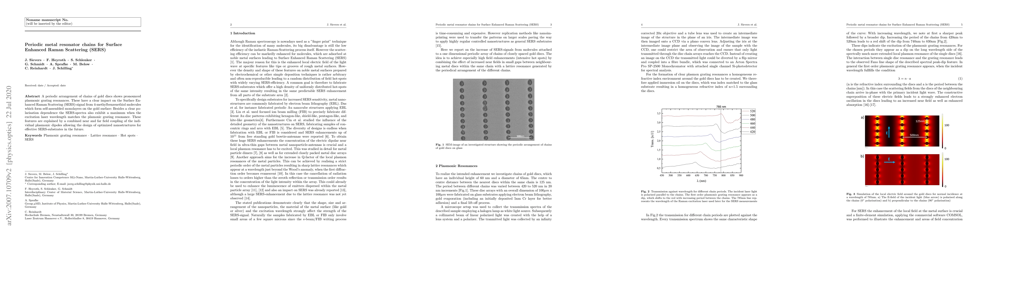 The research demonstrates that periodic gold disc resonator chains exhibit strong plasmonic grating resonances, significantly enhancing the SERS signal from 4-methylbenzenethiol molecules. The optimization of excitation laser wavelengths matches these resonances, suggesting a pathway for designing advanced SERS substrates.