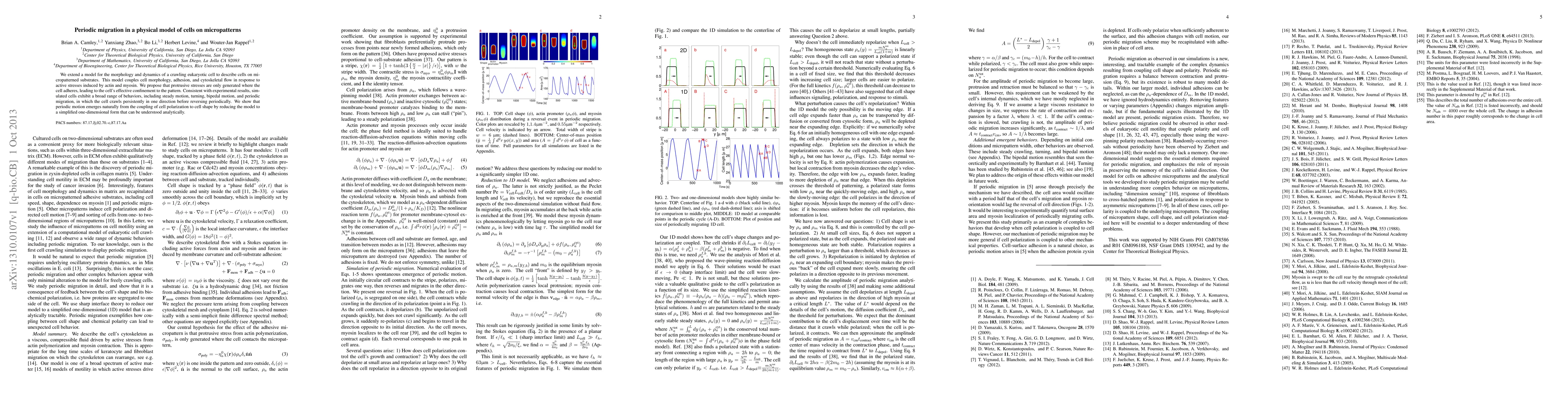 This paper extends a model to describe the behavior of cells on micropatterned substrates, showing that periodic migration arises from the coupling of cell polarization and shape. The model captures a range of cell behaviors, including periodic migration, and is analytically simplified to explain these dynamics.