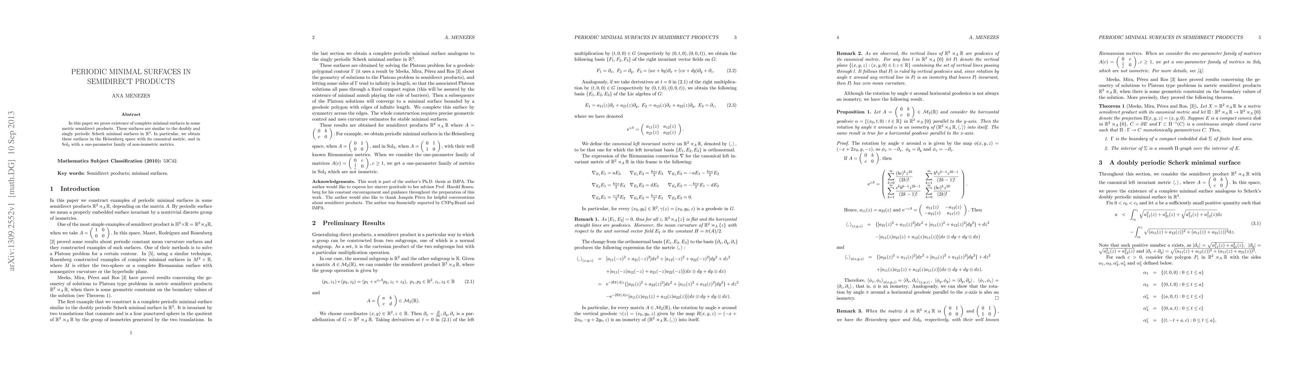 This paper establishes the existence of complete minimal surfaces in certain metric semidirect products, analogous to periodic Scherk surfaces in $\mathbb R^3$, specifically in the Heisenberg space and Sol3 with a non-isometric metric family.