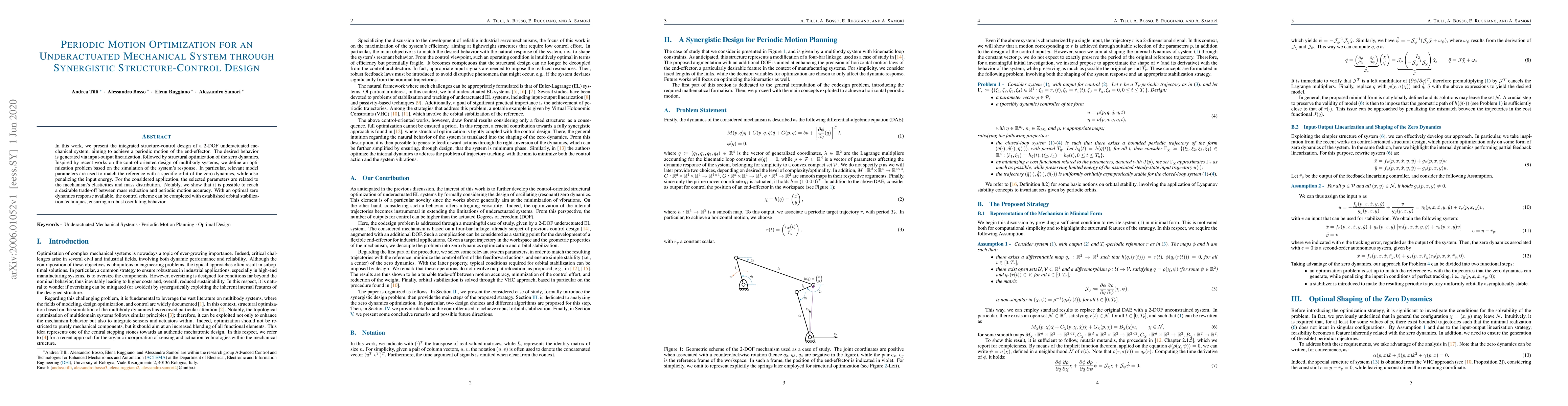 In this work, we present the integrated structure-control design of a 2-DOF underactuated mechanical system, aiming to achieve a periodic motion of the end-effector. The desired behavior is generated via input-output linearization, followed by structural optimization of the zero dynamics. Inspired by recent works on the control-oriented design of multibody systems, we define an optimization problem based on the simulation of the system's response. In particular, relevant model parameters are used to match the reference with a specific orbit of the zero dynamics, while also penalizing the input energy. For the considered application, the selected parameters are related to the mechanism's elasticities and mass distribution. Notably, we show that it is possible to reach a desirable trade-off between mass reduction and periodic motion accuracy. With an optimal zero dynamics response available, the control scheme can be completed with established orbital stabilization techniques, ensuring a robust oscillating behavior.