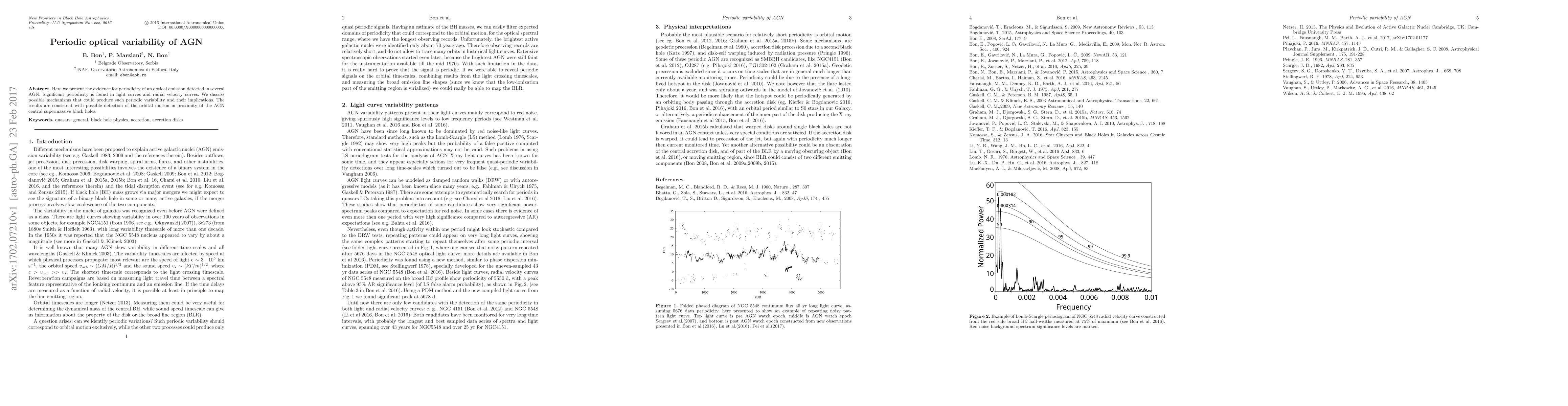 This paper presents evidence for periodic optical emission variability in several active galactic nuclei (AGN), suggesting mechanisms that could be linked to orbital motion near supermassive black holes. The findings imply significant implications for understanding the dynamics in the vicinity of AGN central regions.
