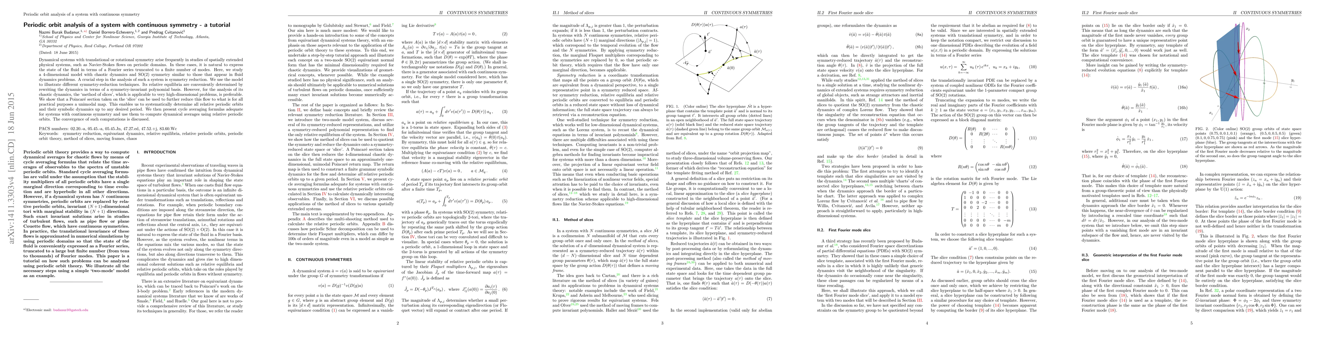 Dynamical systems with translational or rotational symmetry arise frequently in studies of spatially extended physical systems, such as Navier-Stokes flows on periodic domains. In these cases, it is natural to express the state of the fluid in terms of a Fourier series truncated to a finite number of modes. Here, we study a 4-dimensional model with chaotic dynamics and SO(2) symmetry similar to those that appear in fluid dynamics problems. A crucial step in the analysis of such a system is symmetry reduction. We use the model to illustrate different symmetry-reduction techniques. Its relative equilibria are conveniently determined by rewriting the dynamics in terms of a symmetry-invariant polynomial basis. However, for the analysis of its chaotic dynamics, the `method of slices', which is applicable to very high-dimensional problems, is preferable. We show that a Poincar\'e section taken on the `slice' can be used to further reduce this flow to what is for all practical purposes a unimodal map. This enables us to systematically determine all relative periodic orbits and their symbolic dynamics up to any desired period. We then present cycle averaging formulas adequate for systems with continuous symmetry and use them to compute dynamical averages using relative periodic orbits. The convergence of such computations is discussed.