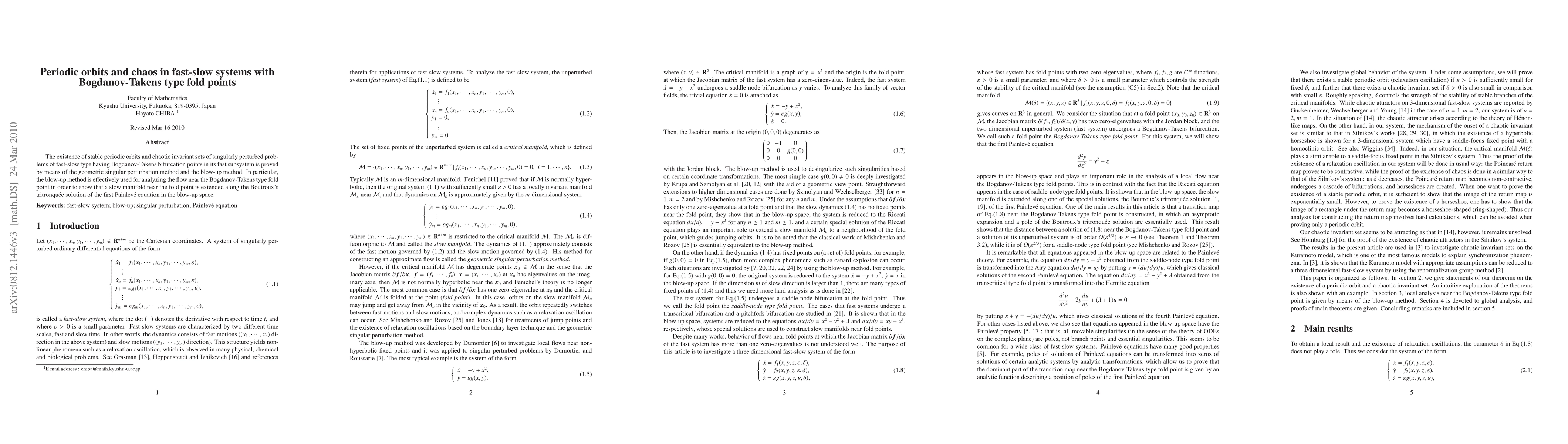 This paper explores the existence of stable periodic orbits and chaotic dynamics in fast-slow systems featuring Bogdanov-Takens bifurcation points, using geometric singular perturbation and blow-up methods. It demonstrates that the slow manifold near the fold point is extended via Boutroux's tritronquée solution of the first Painlevé equation.
