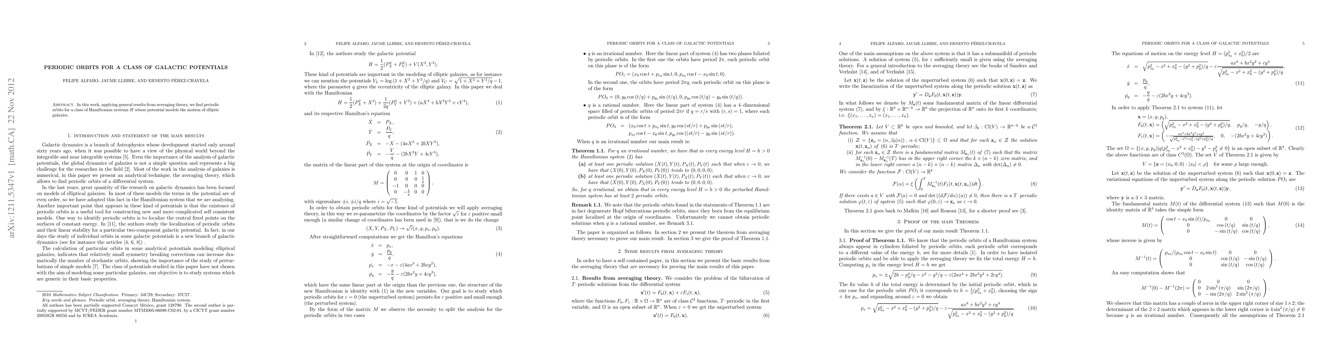 In this work, applying general results from averaging theory, we find periodic orbits for a class of Hamiltonian systems $H$ whose potential models the motion of elliptic galaxies.