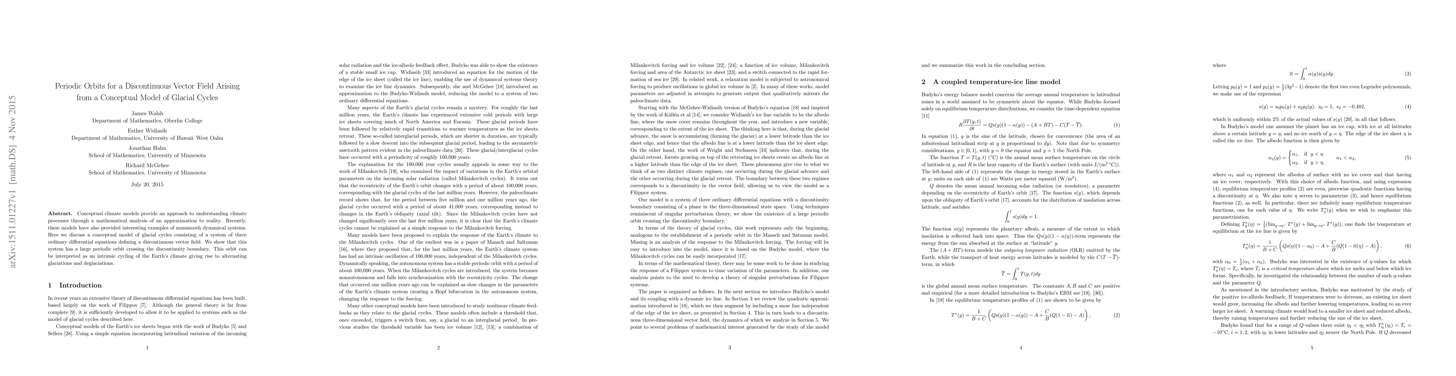 This paper investigates a conceptual model of glacial cycles using a discontinuous vector field defined by three ordinary differential equations, revealing a significant periodic orbit crossing the discontinuity boundary that represents the intrinsic cycling of Earth's climate leading to alternating glaciations and deglaciations.