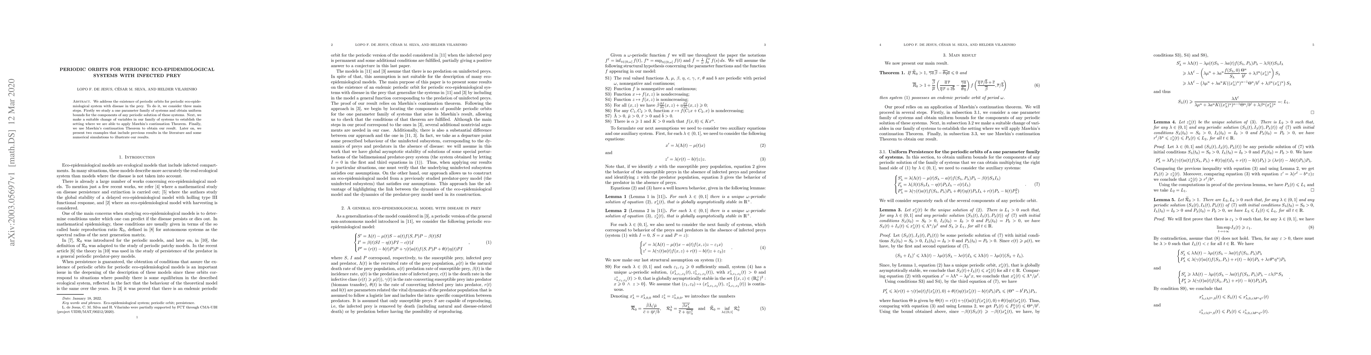This paper investigates the existence of periodic orbits in periodic eco-epidemiological systems with infected prey, employing a combination of uniform bounds, a change of variables, and Mawhin's continuation Theorem to achieve the result. It also includes examples and numerical simulations to validate the findings.