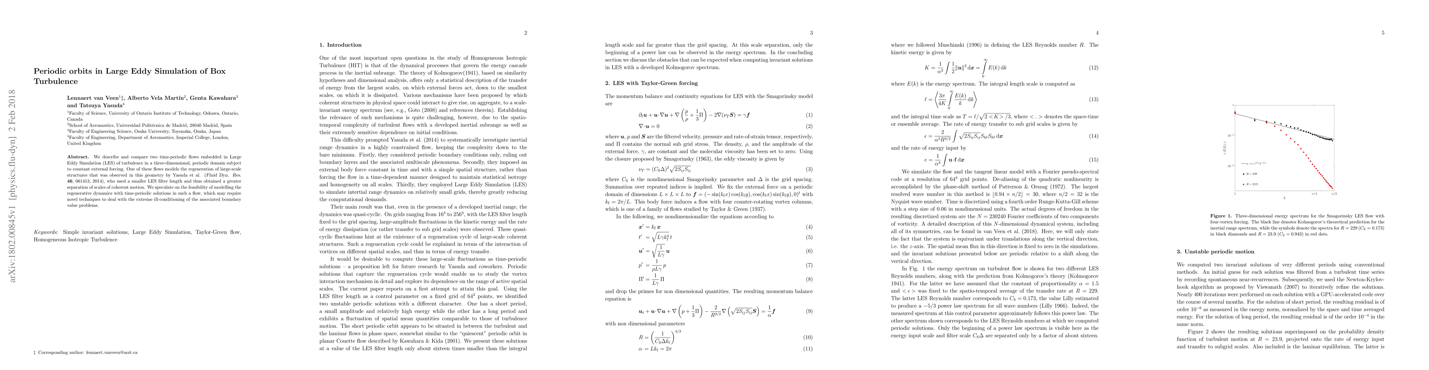 We describe and compare two time-periodic flows embedded in Large Eddy Simulation (LES) of turbulence in a three-dimensional, periodic domain subject to constant external forcing. One of these flows models the regeneration of large-scale structures that was observed in this geometry by Yasuda et al. ({\sl Fluid Dyn. Res.} {\bf 46}, 061413, 2014), who used a smaller LES filter length and thus obtained a greater separation of scales of coherent motion. We speculate on the feasibility of modelling the regenerative dynamics with time-periodic solutions in such a flow, which may require novel techniques to deal with the extreme ill-conditioning of the associated boundary value problems.