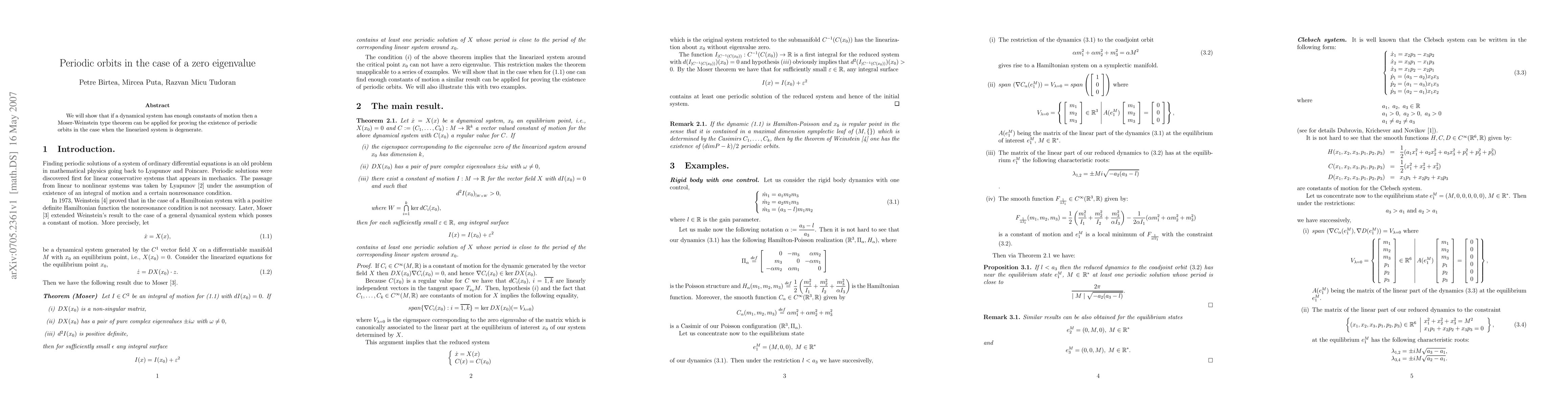 Summary: The paper demonstrates that dynamical systems with sufficient constants of motion can utilize a Moser-Weinstein theorem to establish the existence of periodic orbits, even when the linearized system exhibits degeneracy due to a zero eigenvalue.