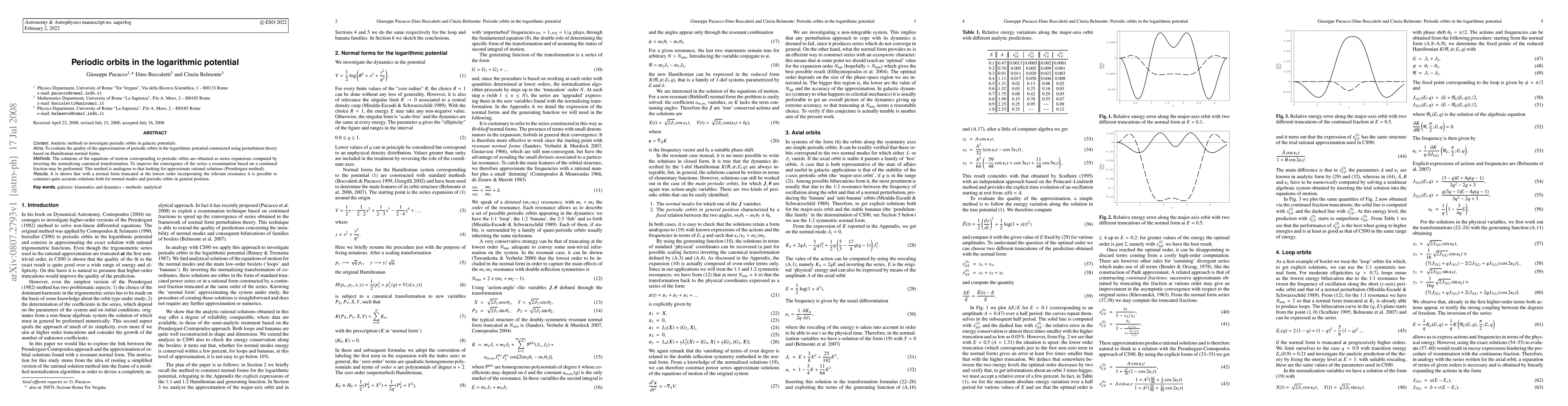 This paper investigates periodic orbits in galactic potentials using perturbation theory based on Hamiltonian normal forms, focusing on the logarithmic potential. It employs a resummation method via continued fractions to enhance series convergence and demonstrates accurate solutions for both normal modes and general periodic orbits.