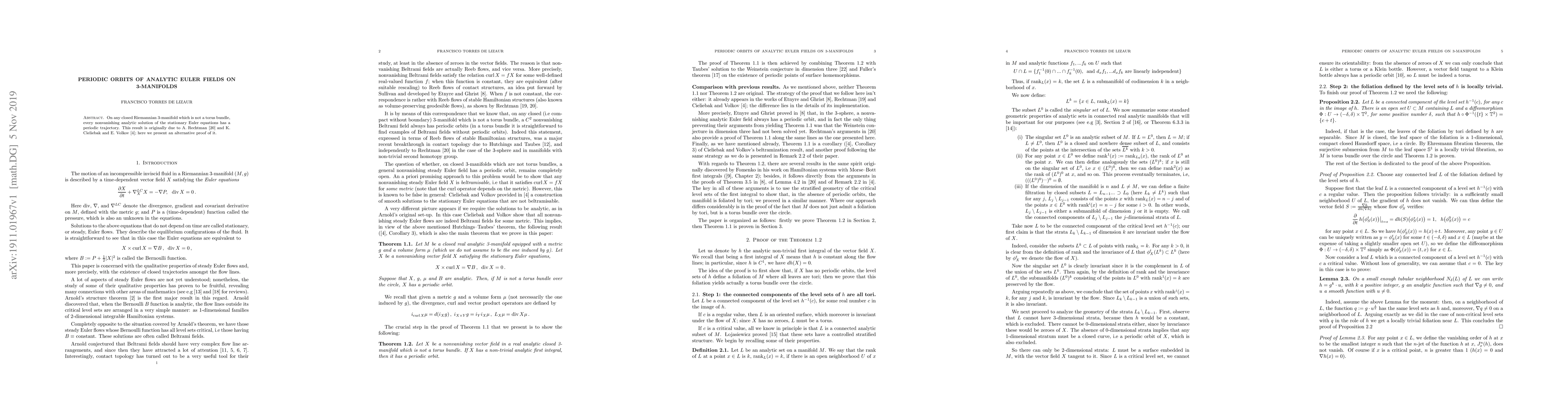 Summary: The paper provides an alternative proof for the existence of periodic orbits in nonvanishing analytic solutions of the stationary Euler equations on closed Riemannian 3-manifolds that are not torus bundles, originally established by Rechtman and Cieliebak-Volkov.