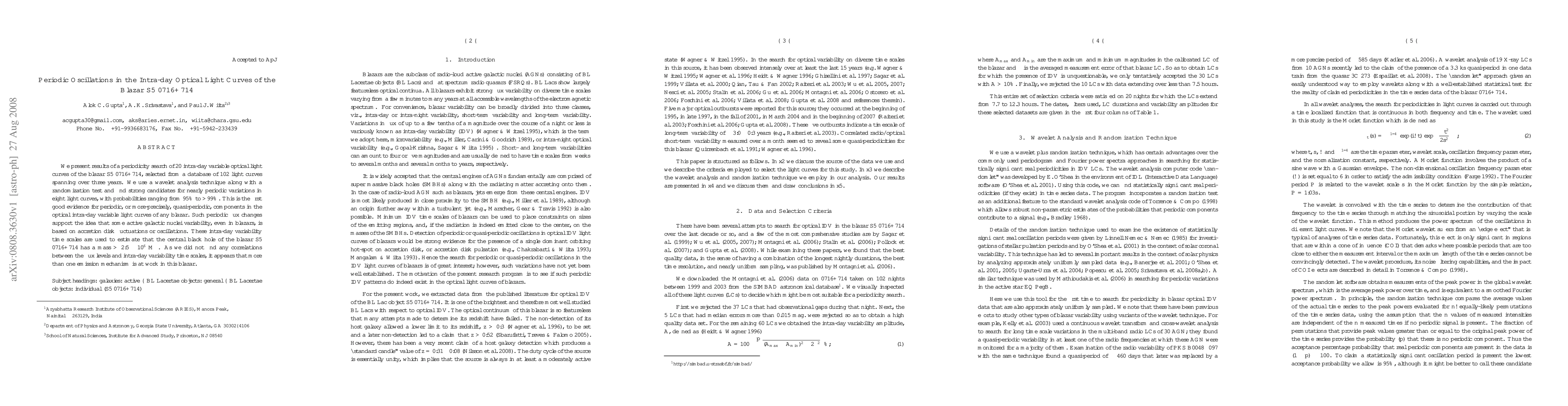 This study identifies nearly periodic variations in the optical light curves of the blazar S5 0716+714 using wavelet analysis, suggesting quasi-periodic components in the intra-day variability of eight light curves. The findings support the theory that accretion disk fluctuations contribute to blazar variability and estimate the central black hole mass to be greater than 2.5 × 10^6 solar masses.