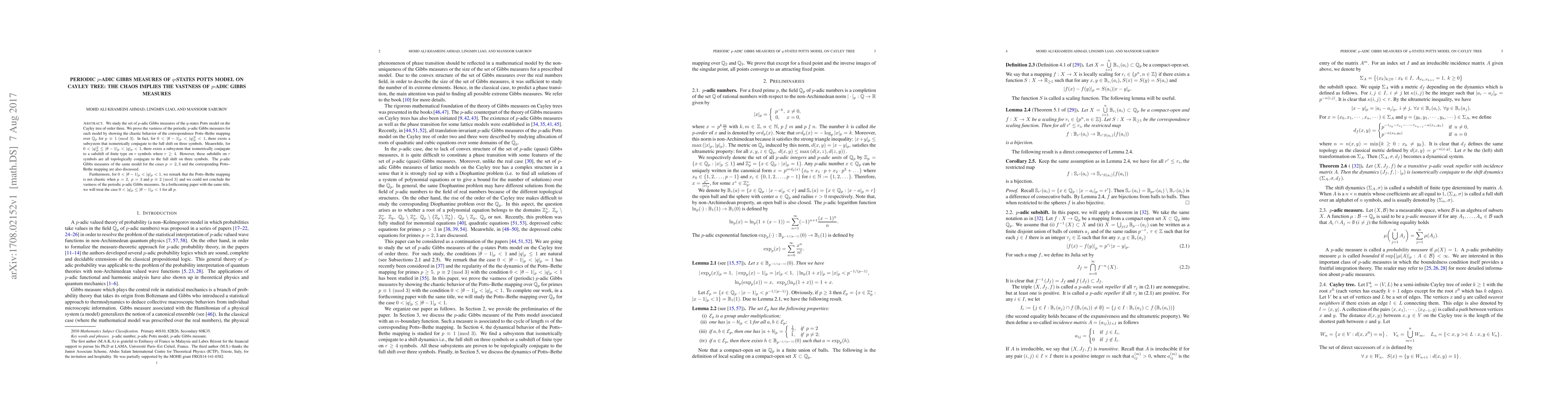 We study the set of $p$-adic Gibbs measures of the $q$-states Potts model on the Cayley tree of order three. We prove the vastness of the periodic $p$-adic Gibbs measures for such model by showing the chaotic behavior of the correspondence Potts--Bethe mapping over $\mathbb{Q}\_p$ for $p\equiv 1 \ (\rm{mod} \ 3)$. In fact, for $0 < |\theta-1|\_p < |q|\_p^2 < 1$, there exists a subsystem that isometrically conjugate to the full shift on three symbols. Meanwhile, for $0 < |q|\_p^2 \leq |\theta-1|\_p < |q|\_p < 1$, there exists a subsystem that isometrically conjugate to a subshift of finite type on $r$ symbols where $r \geq 4$. However, these subshifts on $r$ symbols are all topologically conjugate to the full shift on three symbols. The $p$-adic Gibbs measures of the same model for the cases $p=2,3$ and the corresponding Potts--Bethe mapping are also discussed.Furthermore, for $0 < |\theta-1|\_p < |q|\_p < 1,$ we remark that the Potts--Bethe mapping is not chaotic when $p=2,\ p=3$ and $p\equiv 2 \ (\rm{mod} \ 3)$ and we could not conclude the vastness of the periodic $p$-adic Gibbs measures. In a forthcoming paper with the same title, we will treat the case $0 < |q|\_p \leq |\theta-1|\_p < 1$ for all $p$.