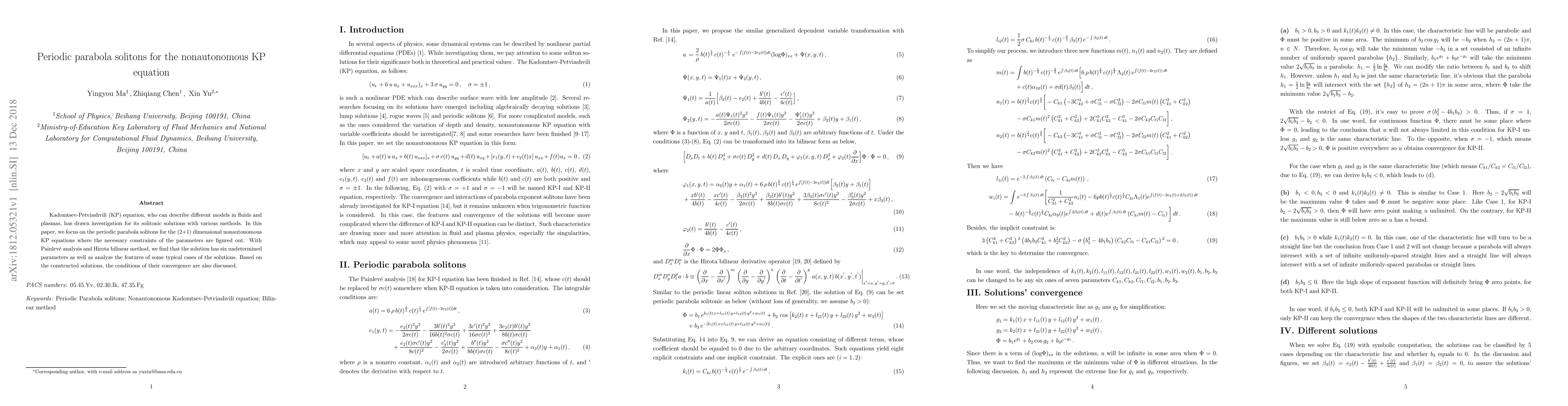 Kadomtsev-Petviashvili (KP) equation, who can describe different models in fluids and plasmas, has drawn investigation for its solitonic solutions with various methods. In this paper, we focus on the periodic parabola solitons for the (2+1) dimensional nonautonomous KP equations where the necessary constraints of the parameters are figured out. With Painleve analysis and Hirota bilinear method, we find that the solution has six undetermined parameters as well as analyze the features of some typical cases of the solutions. Based on the constructed solutions, the conditions of their convergence are also discussed.