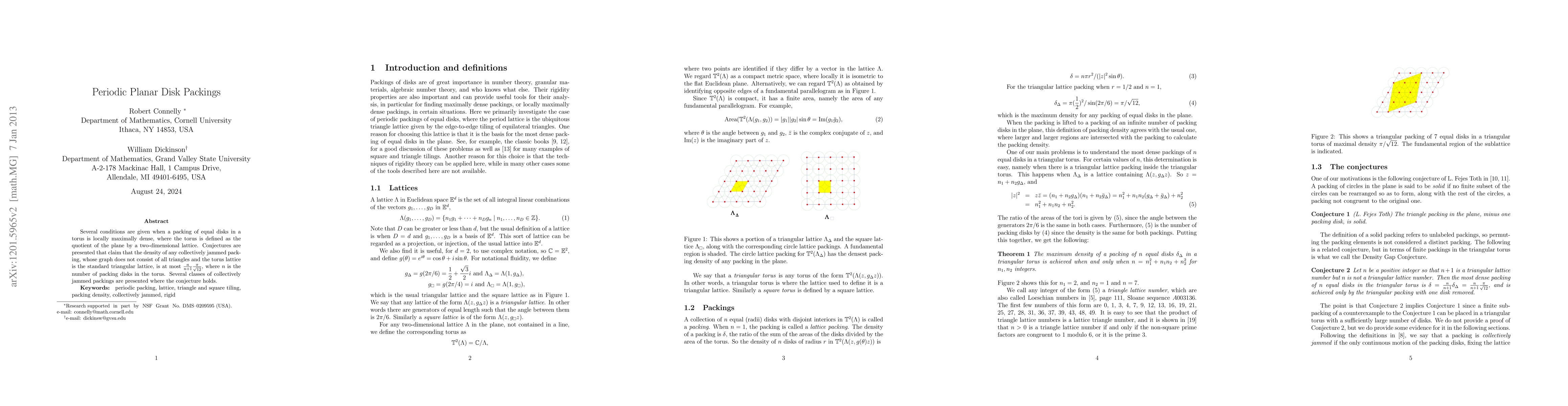 Several conditions are given when a packing of equal disks in a torus is locally maximally dense, where the torus is defined as the quotient of the plane by a two-dimensional lattice. Conjectures are presented that claim that the density of any strictly jammed packings, whose graph does not consist of all triangles and the torus lattice is the standard triangular lattice, is at most $\frac{n}{n+1}\frac{\pi}{\sqrt{12}}$, where $n$ is the number of packing disks. Several classes of collectively jammed packings are presented where the conjecture holds.