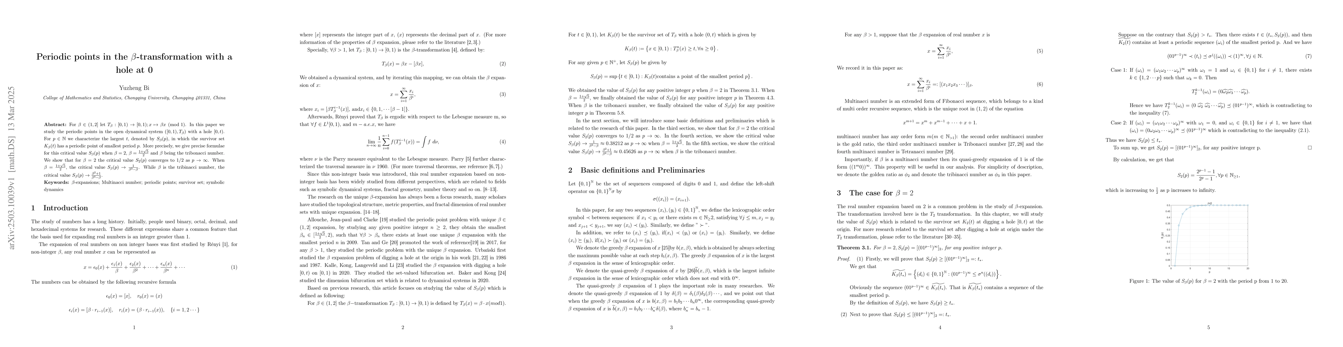The paper employs a detailed analysis of periodic points in the β-transformation with a hole at 0, characterizing the largest t, denoted by S_β(p), for which the survivor set K_β(t) has a periodic point of smallest period p. Precise formulae are given for S_β(p) when β = 2, β = (1+√5)/2, and β as the tribonacci number.