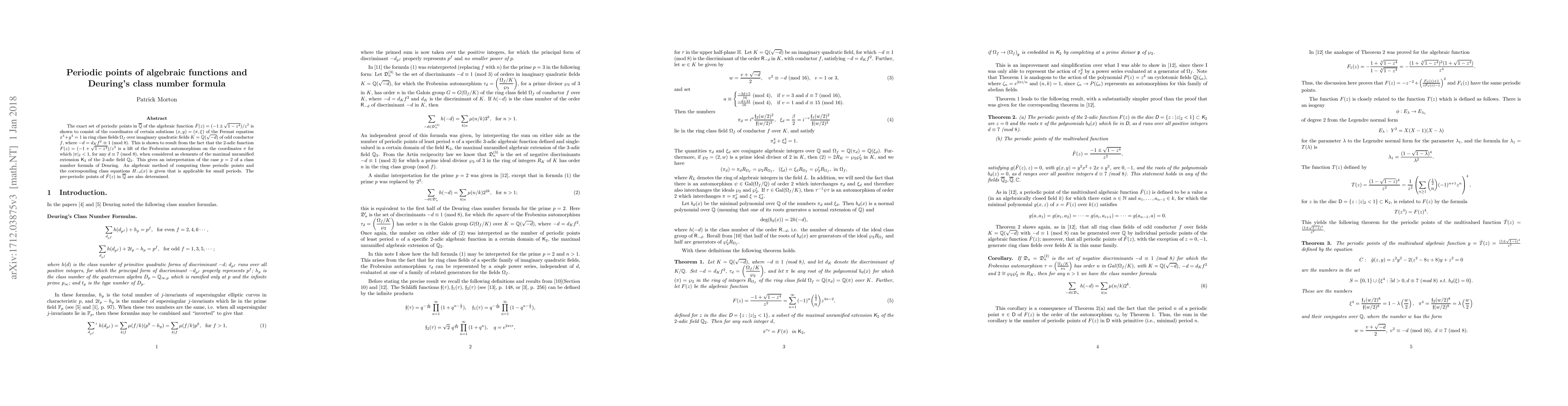 This paper identifies the exact set of periodic points of the algebraic function $\widehat{F}(z)$ as coordinates of solutions to the Fermat equation in ring class fields, linking this to Deuring's class number formula for $p=2$. An algebraic method is provided for computing these points and corresponding class equations for small periods.