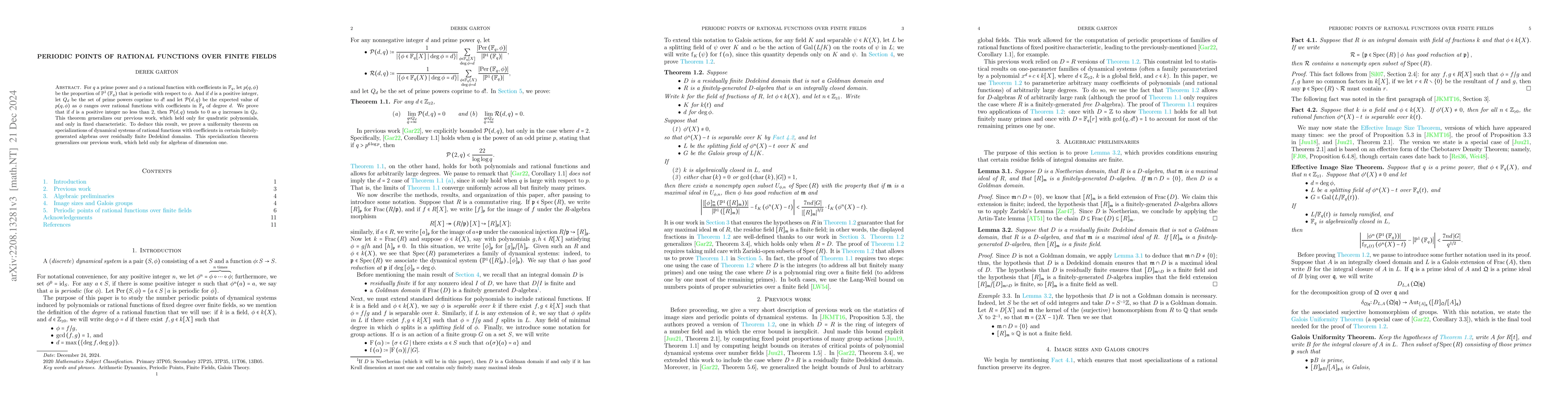 For any $q$ a prime power, $j$ a positive integer, and $\phi$ a rational function with coefficients in $\mathbb{F}_{q^j}$, let $P_{q,j}(\phi)$ be the proportion of $\mathbb{P}^1(\mathbb{F}_{q^j})$ that is periodic with respect to $\phi$. Now suppose that $d$ is an integer greater than 1. We show that if $\gcd{(q,d!)}=1$, then as $j$ increases the expected value of $P_{q,j}(\phi)$, as $\phi$ ranges over rational functions of degree $d$, tends to 0. This theorem generalizes our previous work, which held only for polynomials, and only when $d=2$. To deduce this result, we prove a uniformity theorem on specializations of dynamical systems of rational functions with coefficients in certain finitely-generated algebras over residually finite Dedekind domains. This specialization theorem generalizes our previous work, which held only for algebras of dimension one.
