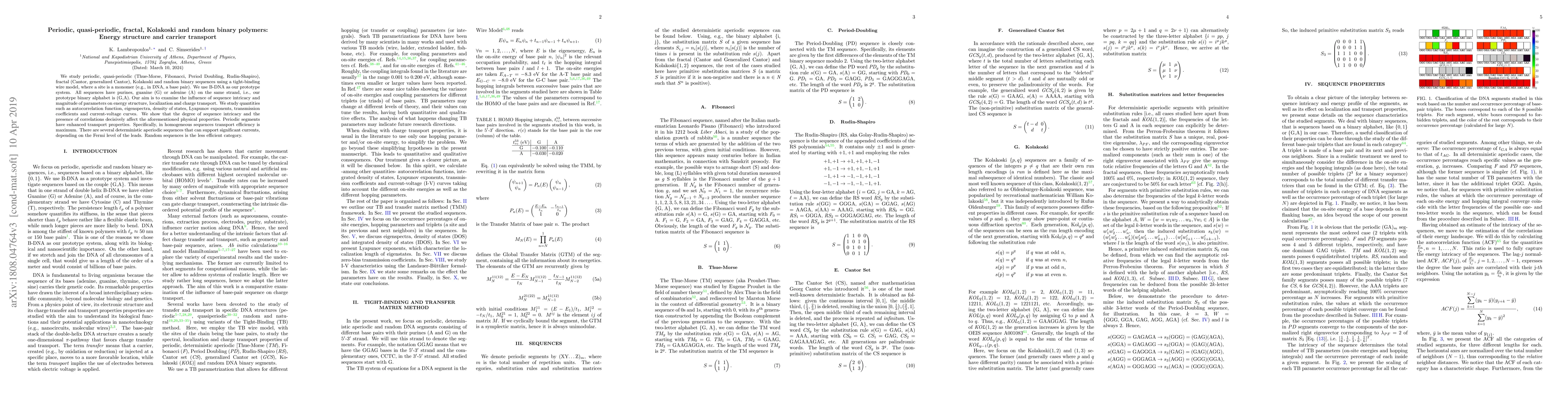 This paper investigates the energy structure and carrier transport in various binary polymer sequences, including periodic, quasi-periodic, fractal, and random types, using a tight-binding wire model. The study reveals that sequence complexity and correlations significantly influence localization and transport properties, with periodic segments showing enhanced transport efficiency.