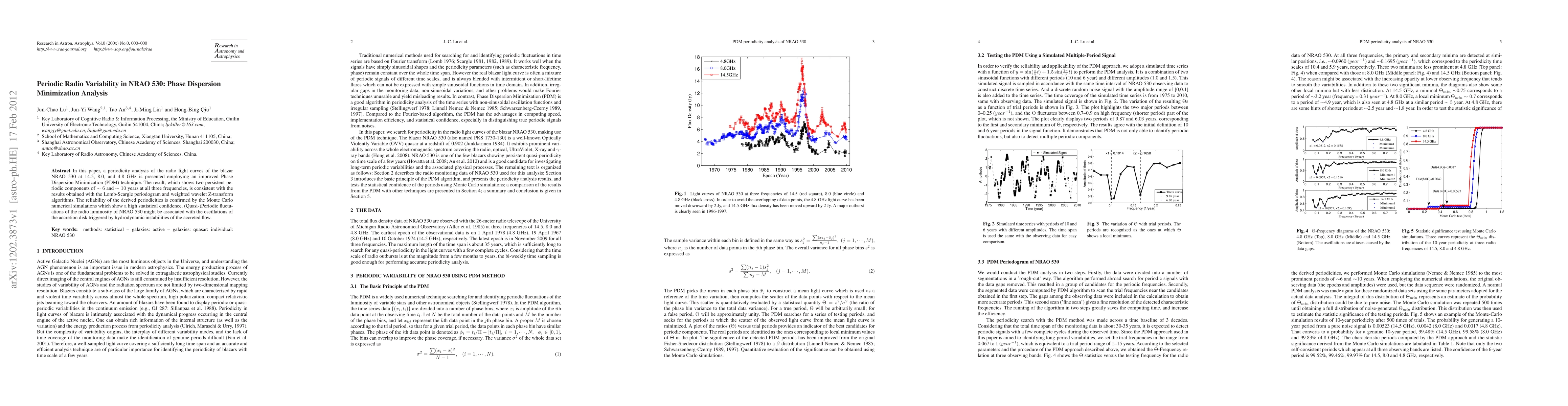 In this paper, a periodicity analysis of the radio light curves of the blazar NRAO 530 at 14.5, 8.0, and 4.8 GHz is presented employing an improved Phase Dispersion Minimization (PDM) technique. The result, which shows two persistent periodic components of $ \sim 6$ and $ \sim 10$ years at all three frequencies, is consistent with the results obtained with the Lomb-Scargle periodogram and weighted wavelet Z-transform algorithms. The reliability of the derived periodicities is confirmed by the Monte Carlo numerical simulations which show a high statistical confidence. (Quasi-)Periodic fluctuations of the radio luminosity of NRAO 530 might be associated with the oscillations of the accretion disk triggered by hydrodynamic instabilities of the accreted flow. \keywords{methods: statistical -- galaxies: active -- galaxies: quasar: individual: NRAO 530}