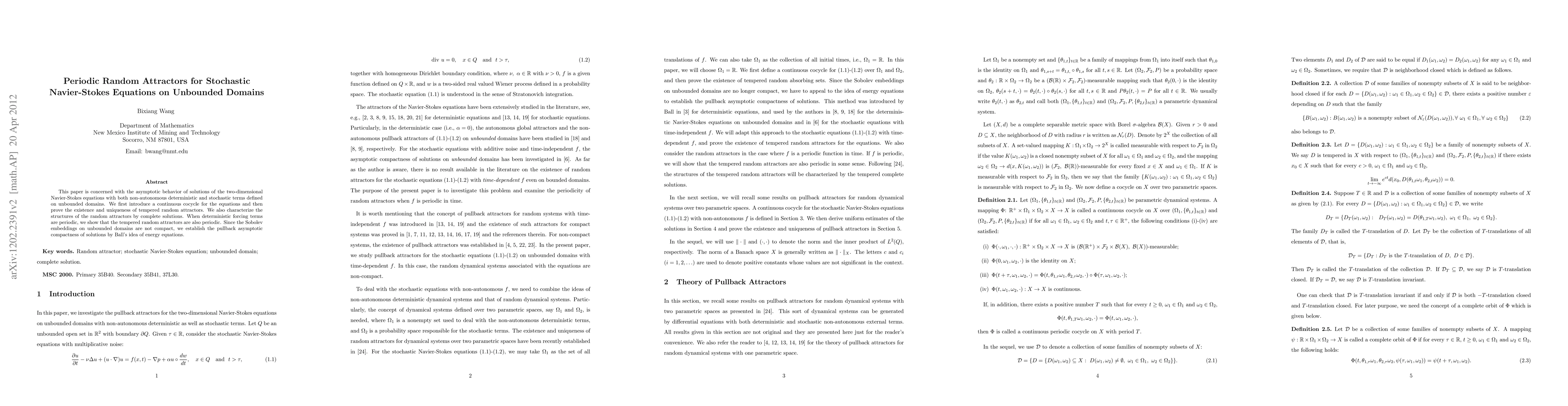 This paper investigates the asymptotic behavior of solutions to stochastic Navier-Stokes equations on unbounded domains, proving the existence of tempered random attractors and their periodicity when deterministic forcing is periodic. The study employs Ball's energy equation method to establish pullback asymptotic compactness.