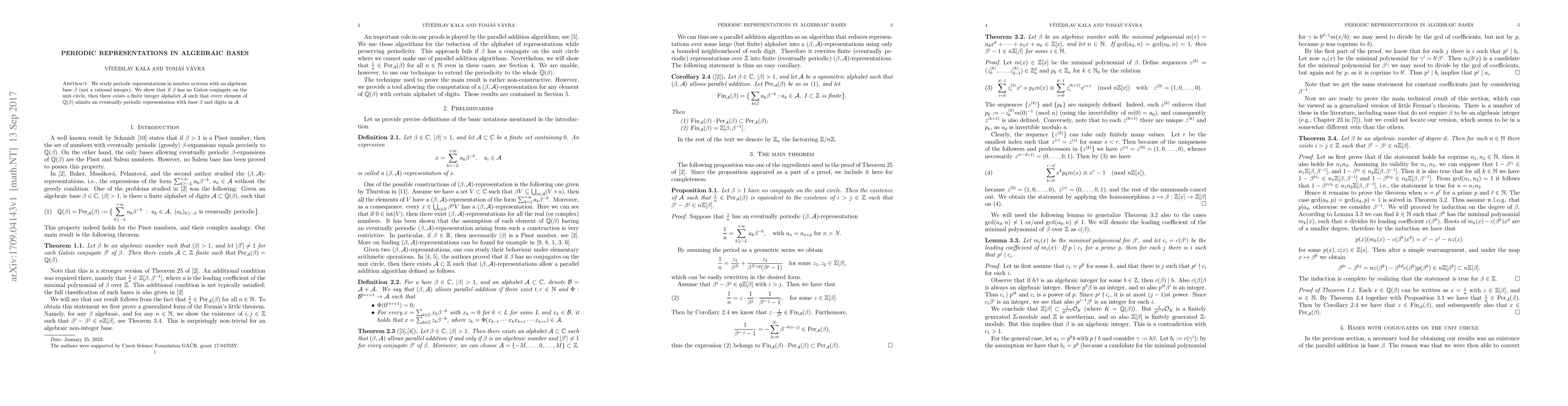 We study periodic representations in number systems with an algebraic base $\beta$ (not a rational integer). We show that if $\beta$ has no Galois conjugate on the unit circle, then there exists a finite integer alphabet $\mathcal A$ such that every element of $\mathbb Q(\beta)$ admits an eventually periodic representation with base $\beta$ and digits in $\mathcal A$.