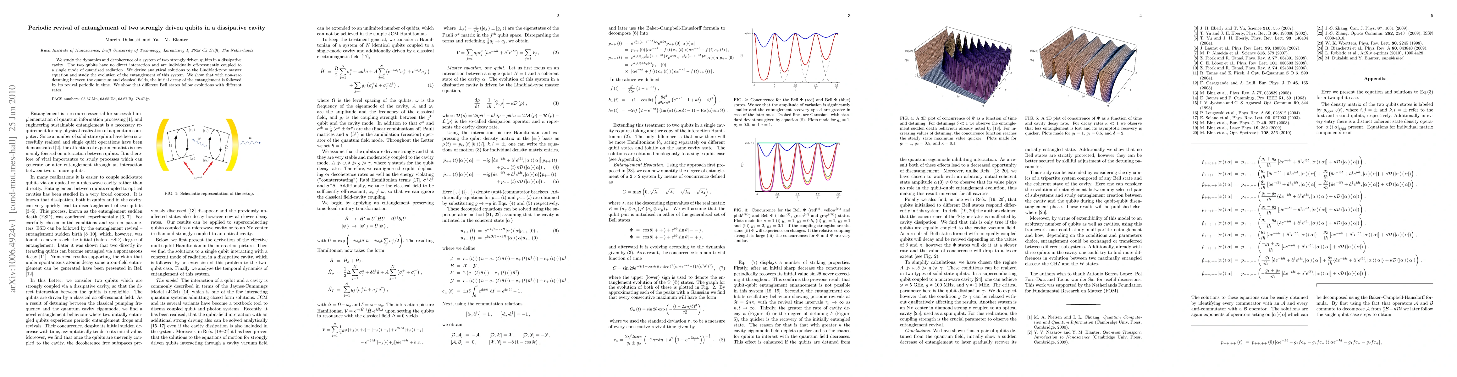 This paper investigates the dynamics of entanglement in two strongly driven qubits in a dissipative cavity, revealing periodic revival of entanglement due to non-zero detuning. Analytical solutions to the master equation show that different Bell states evolve at varying rates, highlighting the complex interplay between quantum and classical fields.