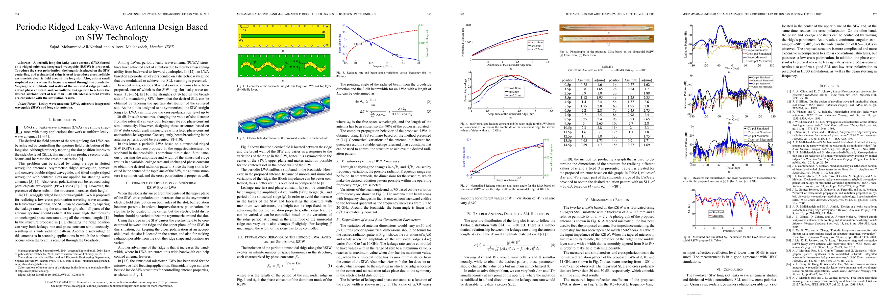 This paper proposes a periodic ridged leaky-wave antenna based on substrate integrated waveguide technology to reduce cross polarization and achieve a controllable leakage rate. The design features a sinusoidal ridge to produce an asymmetric electric field, ensuring minimal sidelobe levels below 30 dB and a small stopband during beam scanning.