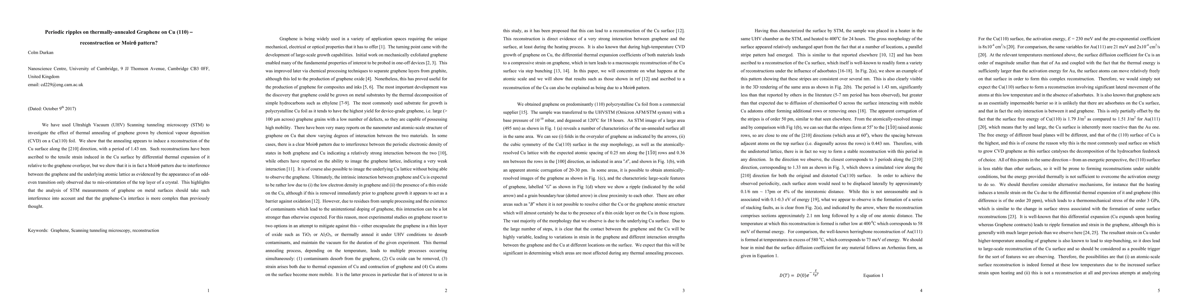 This study uses UHV STM to investigate thermally annealed graphene on Cu(110), revealing a 1.43 nm reconstruction initially thought to be tensile strain-induced but identified as a Moiré pattern due to graphene-Cu lattice interference. This complexity underscores the need for careful analysis of STM measurements in graphene-metal interfaces.