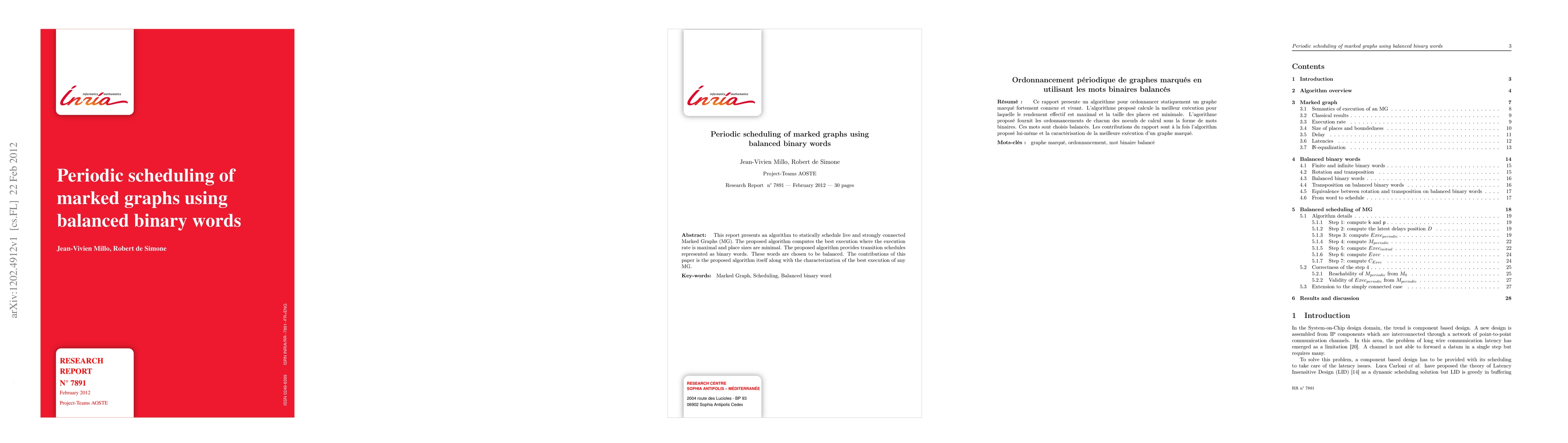 This report presents an algorithm to statically schedule live and strongly connected Marked Graphs (MG). The proposed algorithm computes the best execution where the execution rate is maximal and place sizes are minimal. The proposed algorithm provides transition schedules represented as binary words. These words are chosen to be balanced. The contributions of this paper is the proposed algorithm itself along with the characterization of the best execution of any MG.