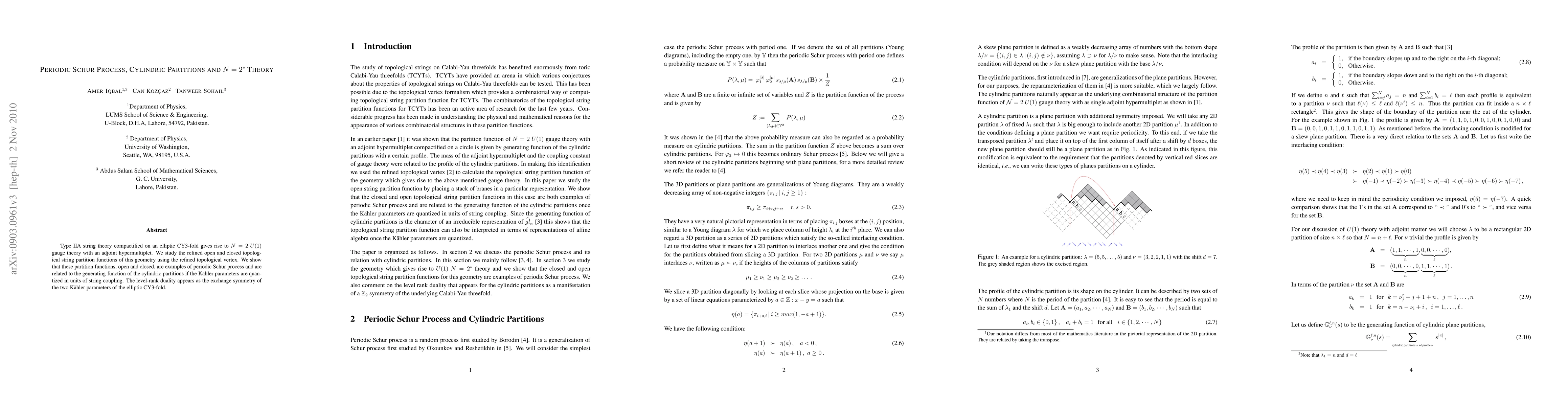 Type IIA string theory compactified on an elliptic CY3-fold gives rise to N=2 U(1) gauge theory with an adjoint hypermultiplet. We study the refined open and closed topological string partition functions of this geometry using the refined topological vertex. We show that these partition functions, open and closed, are examples of periodic Schur process and are related to the generating function of the cylindric partitions if the Kahler parameters are quantized in units of string coupling. The level-rank duality appears as the exchange symmetry of the two Kahler parameters of the elliptic CY3-fold.