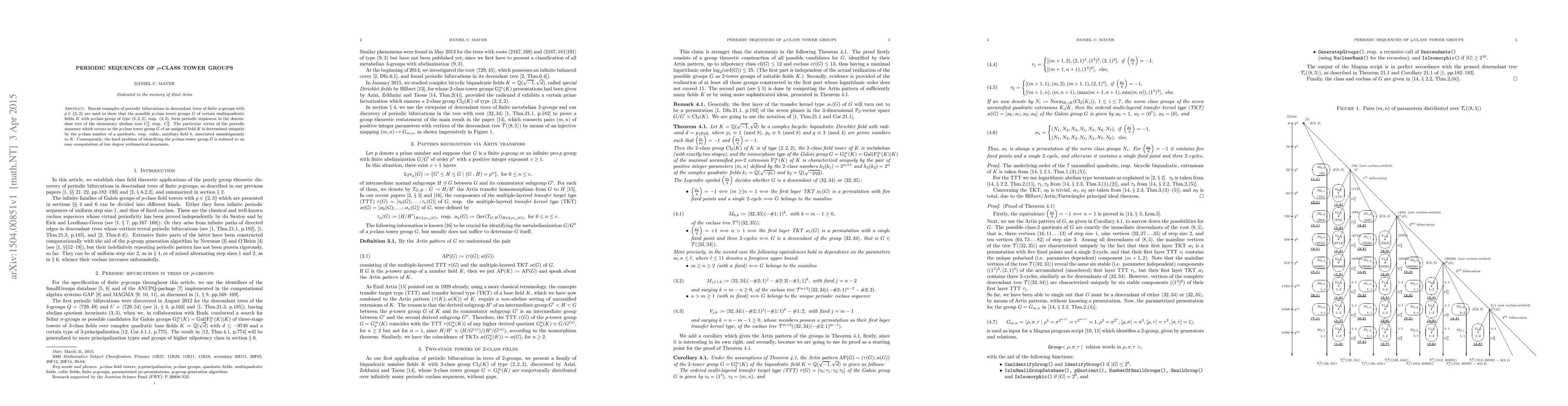 Recent examples of periodic bifurcations in descendant trees of finite p-groups with p in {2,3} are used to show that the possible p-class tower groups G of certain multiquadratic fields K with p-class group of type (2,2,2), resp. (3,3), form periodic sequences in the descendant tree of the elementary abelian root C(2)xC(2)xC(2), resp. C(3)xC(3). The particular vertex of the periodic sequence which occurs as the p-class tower group G of an assigned field K is determined uniquely by the p-class number of a quadratic, resp. cubic, auxiliary field k, associated unambiguously to K. Consequently, the hard problem of identifying the p-class tower group G is reduced to an easy computation of low degree arithmetical invariants.