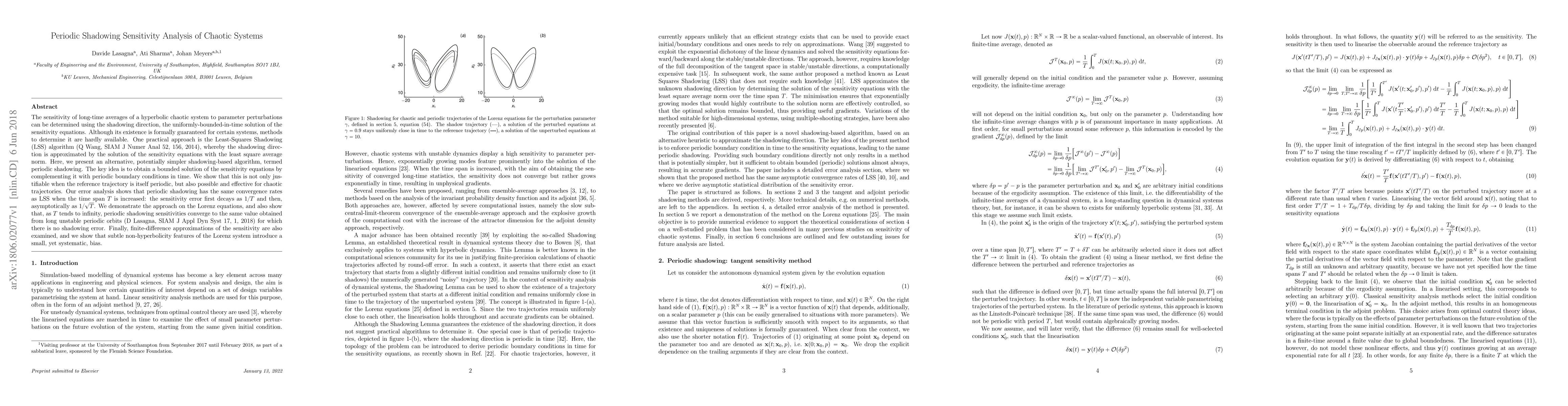 This paper proposes a new method called periodic shadowing to analyze the sensitivity of chaotic systems to parameter perturbations. The method uses periodic boundary conditions to obtain a bounded solution of the sensitivity equations, showing comparable convergence rates to the Least-Squares Shadowing algorithm. The approach is demonstrated on the Lorenz equations, revealing a systematic bias due to non-hyperbolicity features.