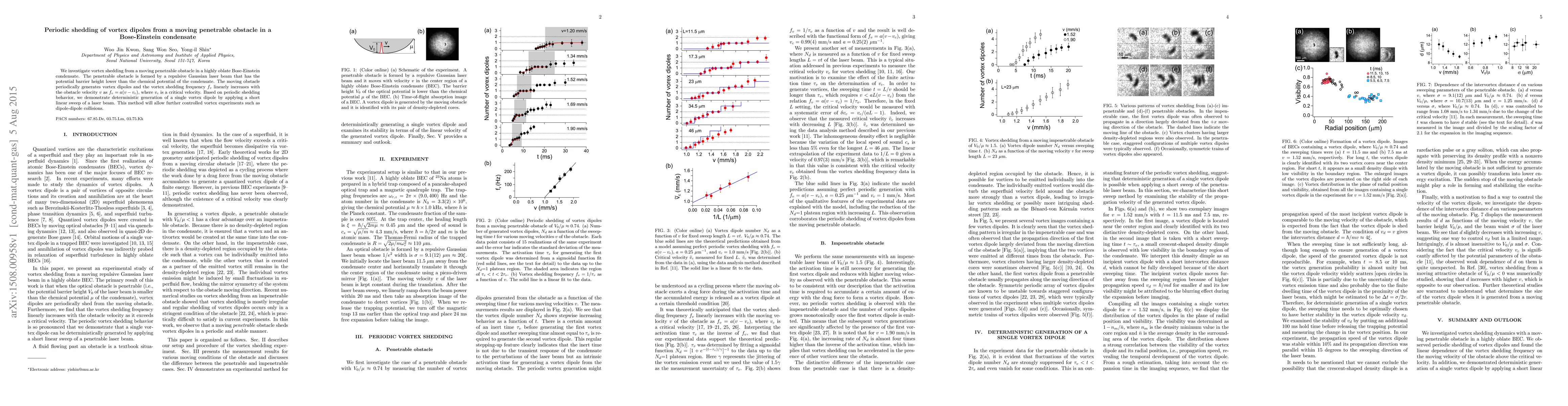 This paper studies vortex dipole shedding from a moving penetrable obstacle in a Bose-Einstein condensate, finding that vortex shedding frequency linearly increases with obstacle velocity below a critical velocity. The authors demonstrate controlled generation of single vortex dipoles via a short laser sweep, enabling potential experiments on dipole interactions.