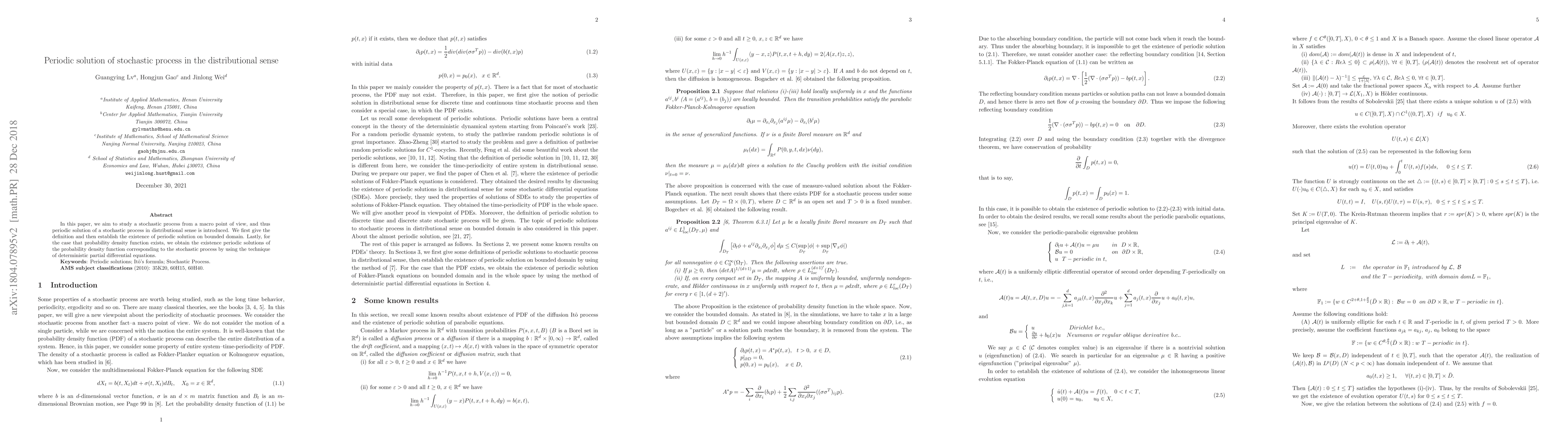 In this paper, we aim to study a stochastic process from a macro point of view, and thus periodic solution of a stochastic process in distributional sense is introduced. We first give the definition and then establish the existence of periodic solution on bounded domain. Lastly, for the case that probability density function exists, we obtain the existence periodic solutions of the probability density function corresponding to the stochastic process by using the technique of deterministic partial differential equations.