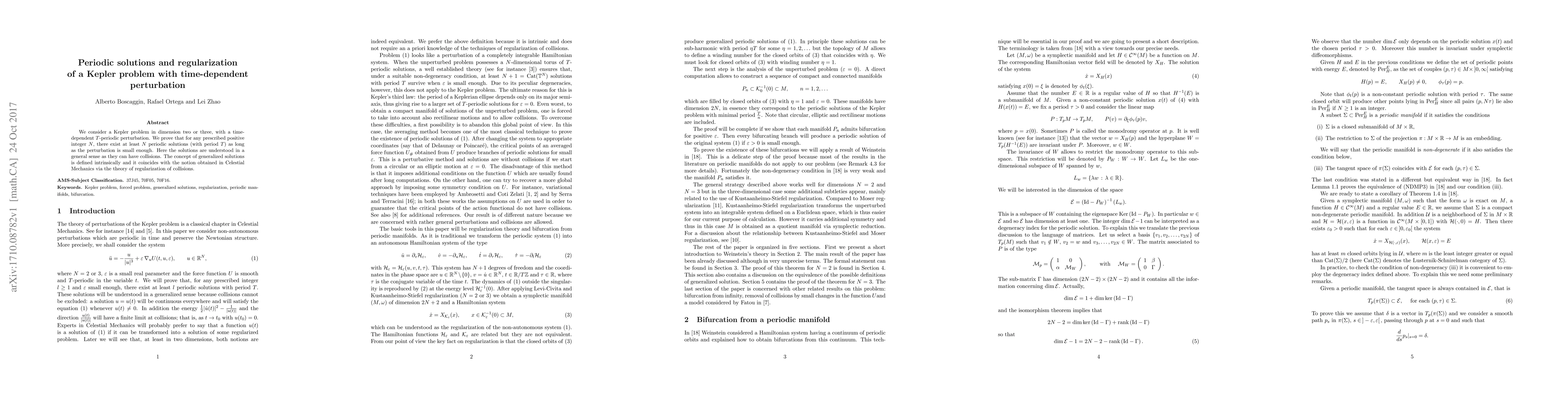 Summary: This paper proves the existence of at least $N$ periodic solutions for a Kepler problem with a small, time-dependent perturbation, demonstrating that these solutions can include collisions, which are regularized using intrinsic generalized solutions.