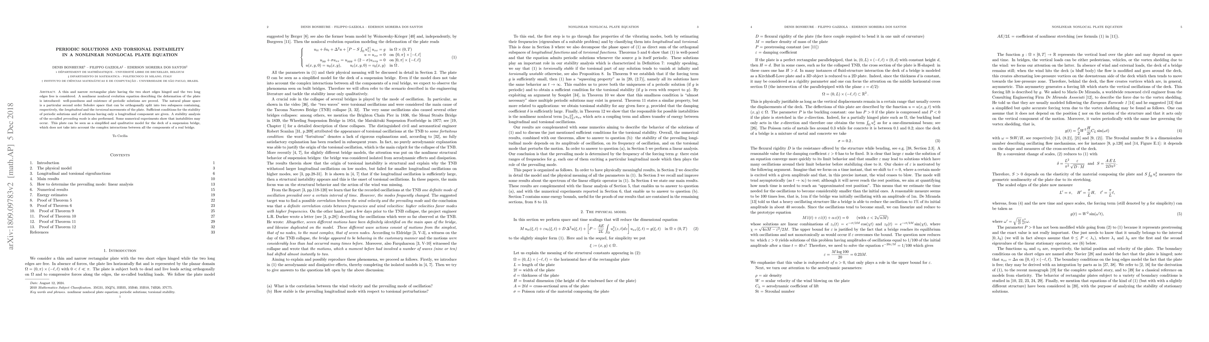 A thin and narrow rectangular plate having the two short edges hinged and the two long edges free is considered. A nonlinear nonlocal evolution equation describing the deformation of the plate is introduced: well-posedness and existence of periodic solutions are proved. The natural phase space is a particular second order Sobolev space that can be orthogonally split into two subspaces containing, respectively, the longitudinal and the torsional movements of the plate. Sufficient conditions for the stability of periodic solutions and of solutions having only a longitudinal component are given. A stability analysis of the so-called prevailing mode is also performed. Some numerical experiments show that instabilities may occur. This plate can be seen as a simplified and qualitative model for the deck of a suspension bridge, which does not take into account the complex interactions between all the components of a real bridge.