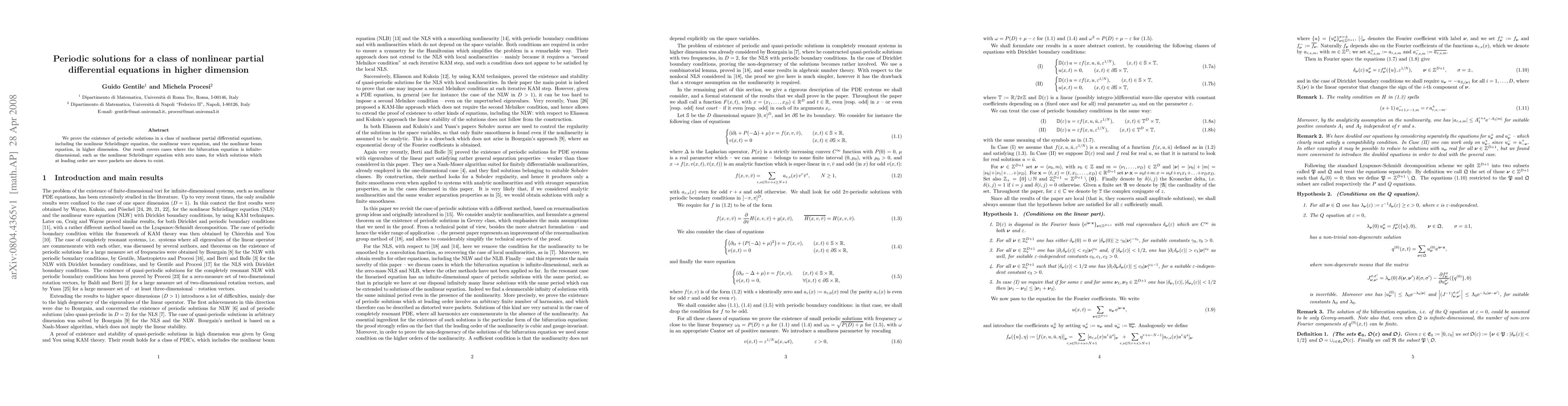 This paper proves the existence of periodic solutions for a class of nonlinear partial differential equations, including the nonlinear Schrödinger, wave, and beam equations in higher dimensions, even when the bifurcation equation is infinite-dimensional, such as the zero mass nonlinear Schrödinger equation, demonstrating the existence of wave packet solutions at leading order.